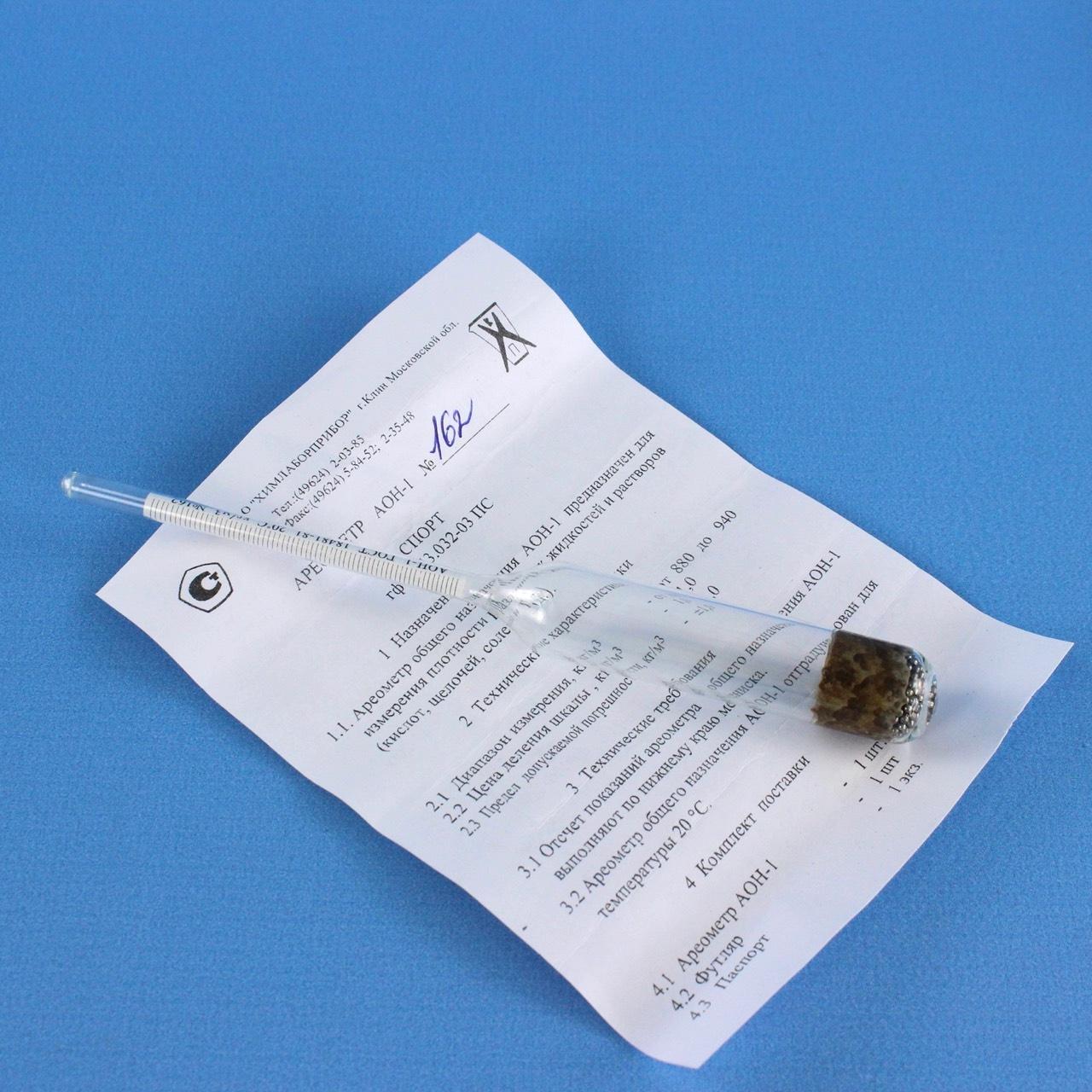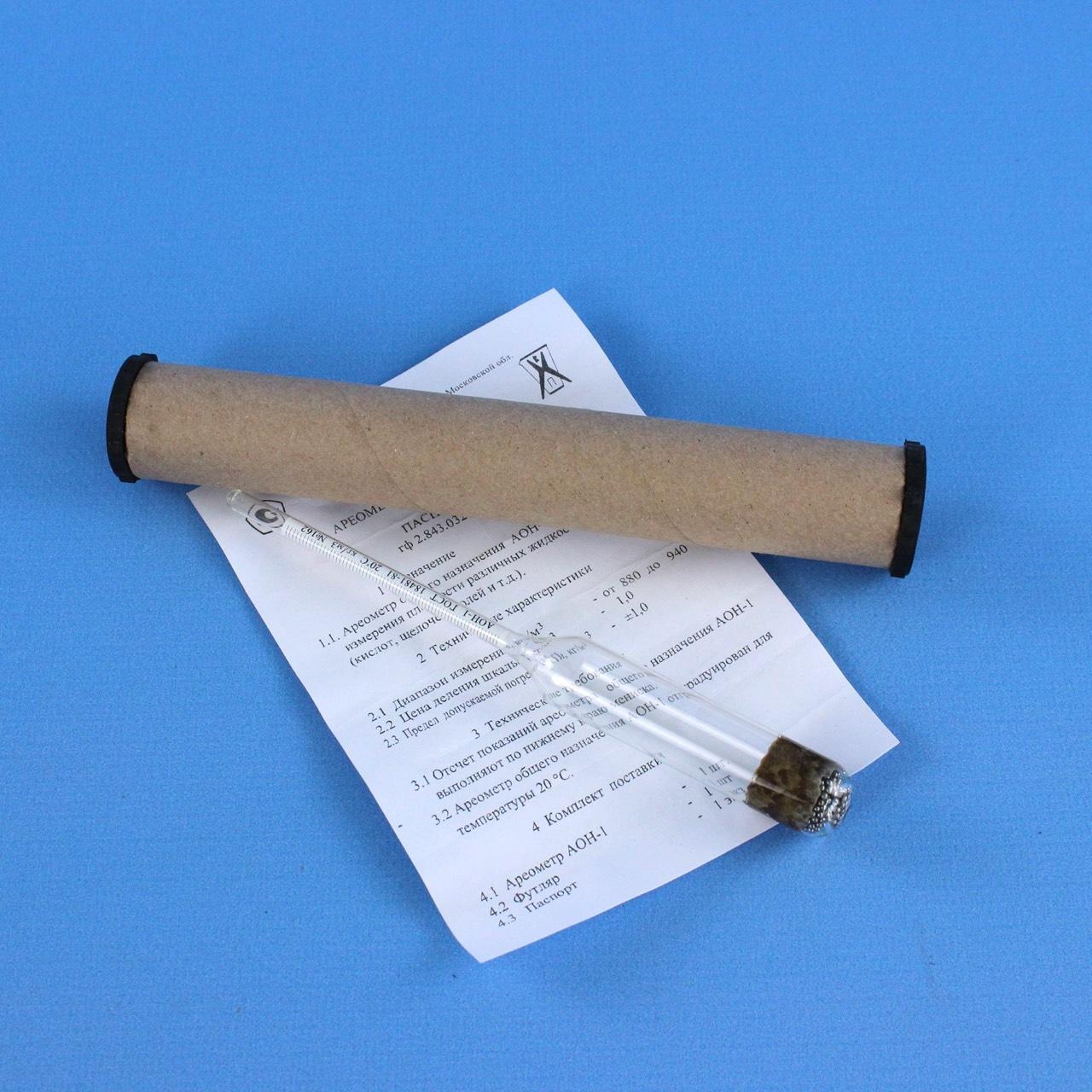 Ареометр общего назначения АОН-1 (880...940 кг/м³), (ГОСТ 18481-81). универсальный лабораторный ареометр, рассчитанный на быстрый контроль плотности практически любых жидкостей: от лёгких органических растворителей до насыщенных солевых растворов и технических масел. Данный вид ареометров закрывает 95 % типовых задач производства, НИОКР и учебных лабораторий, позволяя оперативно вносить коррективы в технологические процессы и подтверждать качество готовой продукции.