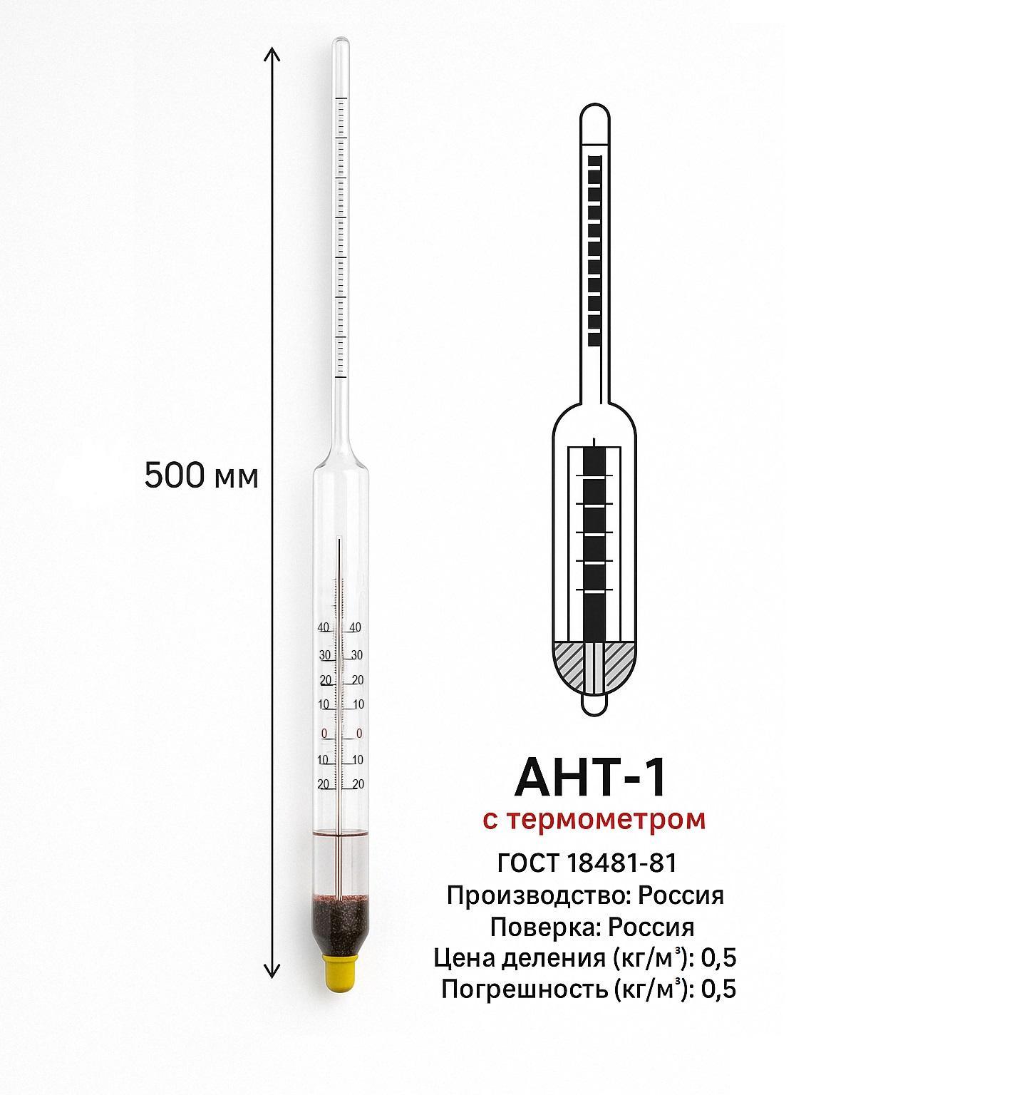 Ареометр для нефти и нефтепродуктов АНТ-1 - точный ареометр для определения плотности нефтепродуктов и нефти, совмещённый с термометром для повышения точности измерения. Ареометр поверен, поставляется с паспортом и свидетельством о прохождении метрологического учёта.