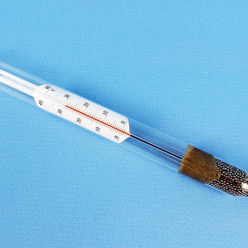 Ареометр для сахара АСТ-2 (5...15%), с термометром, (ГОСТ 18481-81). омбинированный сахаромер с встроенным стеклянным термометром, позволяющий одновременно измерять массовую долю сахара и фактическую температуру образца (0…+40 °C) прямо в цилиндре, без внешних термометров. Серия используется для быстрого контроля концентрации сухих веществ при приготовлении сиропов, суслов, соков и других сахаросодержащих растворов в соответствии с ГОСТ 18481-81.