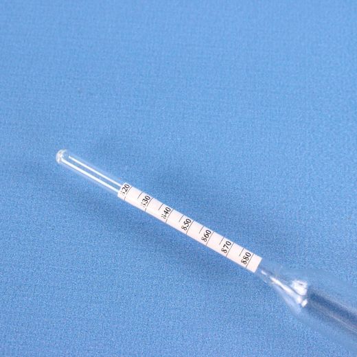Ареометр общего назначения АОН-1 (820...880 кг/м³), (ГОСТ 18481-81). универсальный лабораторный ареометр, рассчитанный на быстрый контроль плотности практически любых жидкостей: от лёгких органических растворителей до насыщенных солевых растворов и технических масел. Данный вид ареометров закрывает 95 % типовых задач производства, НИОКР и учебных лабораторий, позволяя оперативно вносить коррективы в технологические процессы и подтверждать качество готовой продукции.