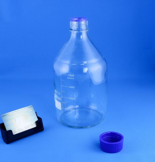 Винтовая синяя крышка позволяет автоклавировать до 140 градусов по Цельсию, она имеет прокладку, которая надёжно защищает содержимое от воздействий внешней среды. Для удобства эксплуатации на поверхности бутыли нанесена цифровая градуировка.