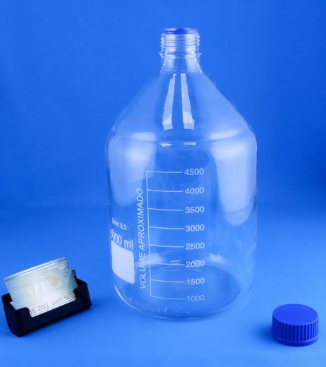 Винтовая синяя крышка позволяет автоклавировать до 140 градусов по Цельсию, она имеет прокладку, которая надёжно защищает содержимое от воздействий внешней среды. Для удобства эксплуатации на поверхности бутыли нанесена цифровая градуировка.