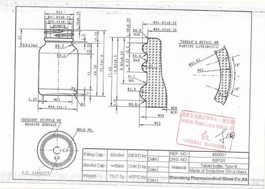 Флакон 60 мл для таблеток тёмное стекло, без крышки, 128 шт/упак