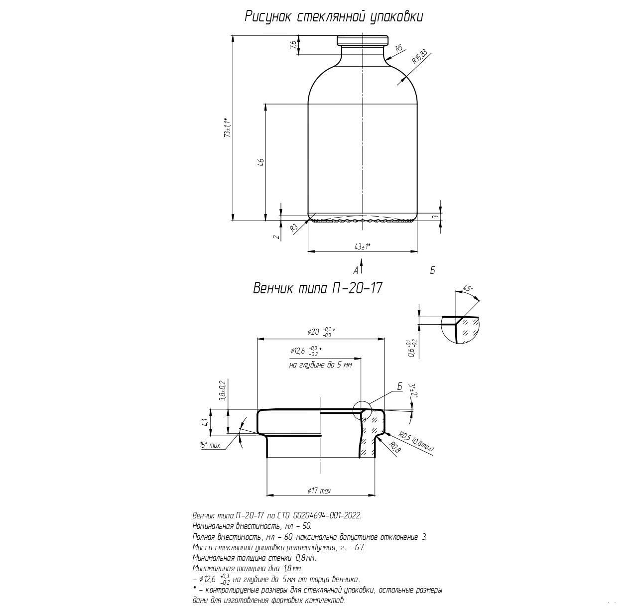 Флакон инъекционный ФП-50-20, 50 мл, светлое стекло, круглый скат горла, гладкое горло, без пробки, 9600 шт/паллет