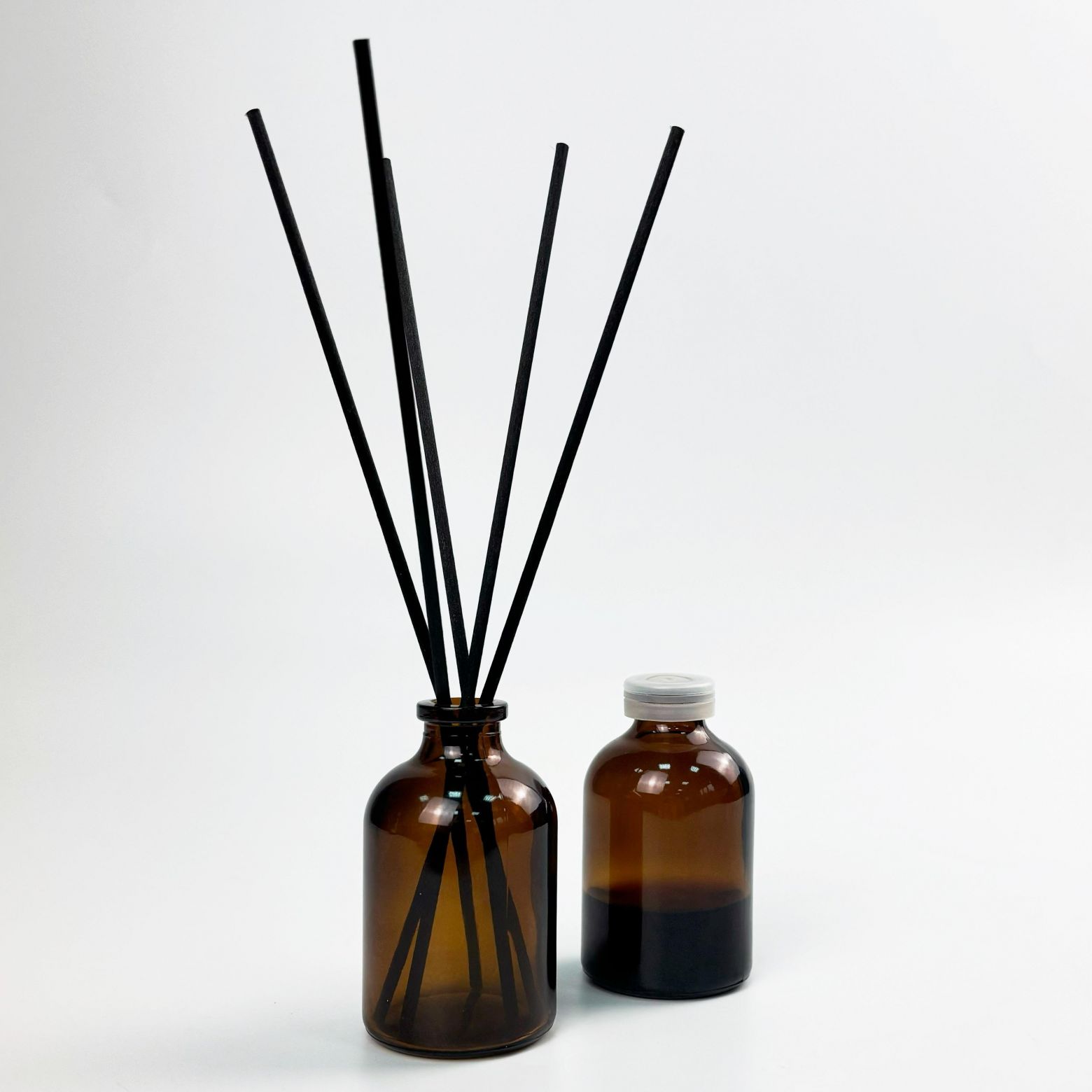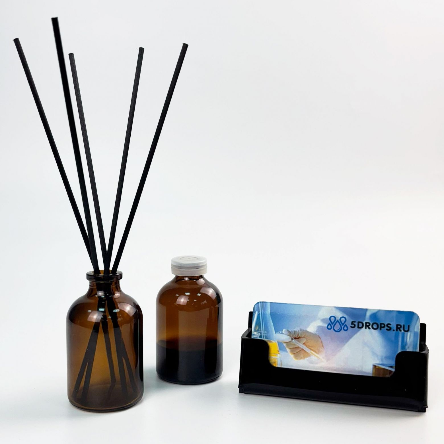 Этот комплект флаконов для диффузоров от 5drops включает в себя флаконы объемом 50 мл, изготовленные из тёмного литого стекла, и совместимые пластиковые пробки-заглушки, которые защищают содержимое от протекания. Флаконы обладают гладким горлом, что обеспечивает их безопасность и облегчает использование диффузора.