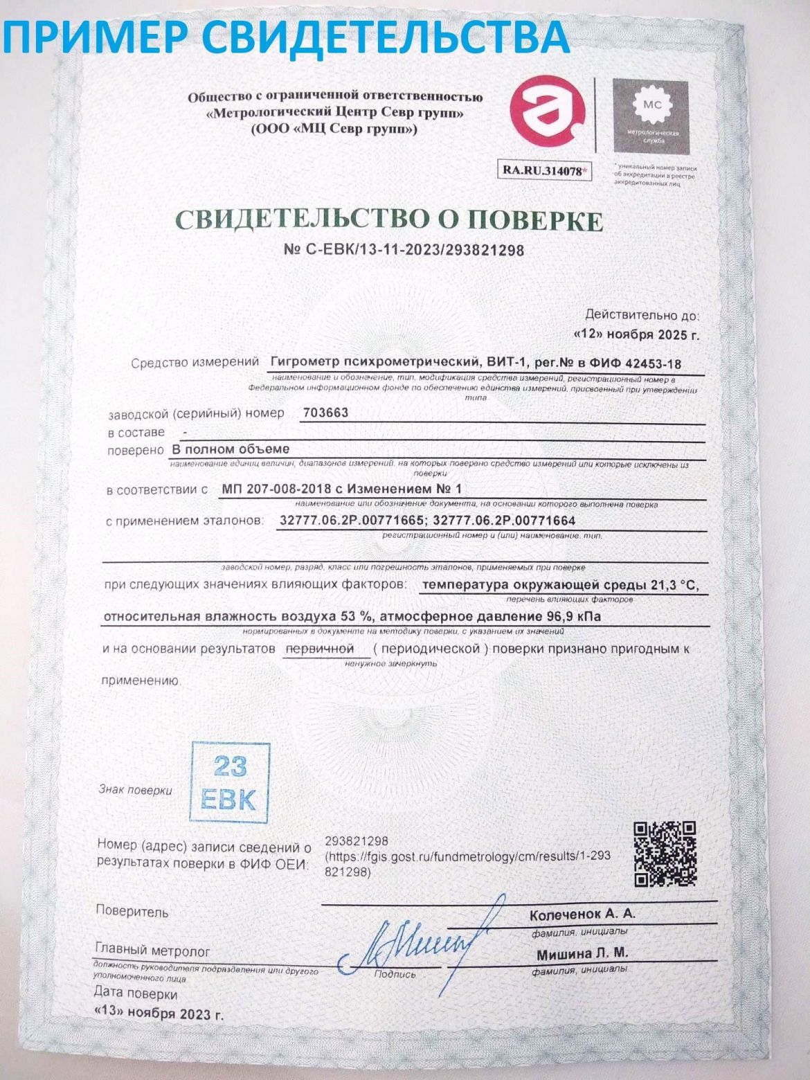 Гигрометры психрометрические ВИТ-1 полностью соответствуют ТУ У 33.2-24667973-003:2006 . Как и любой другой измерительный прибор российского или украинского производства - гигрометры проходят обязательную первичную заводскую поверку и поставляются со свидетельством о прохождении поверки.