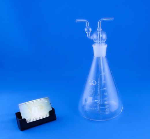 Химическая ловушка Ле-Шателье для конденсации и очистки газов на 1000 мл по своему принципу работы является увеличенной в размерах копией классической склянки Дрекселя, но в отличии от нее, имеет коническую форму и снабжена не доходящей до дна на ⅓ от высоты стеклянной трубкой, что позволяет использовать данную емкость в большем количестве химических процессов, чем классическую по форме склянку.
