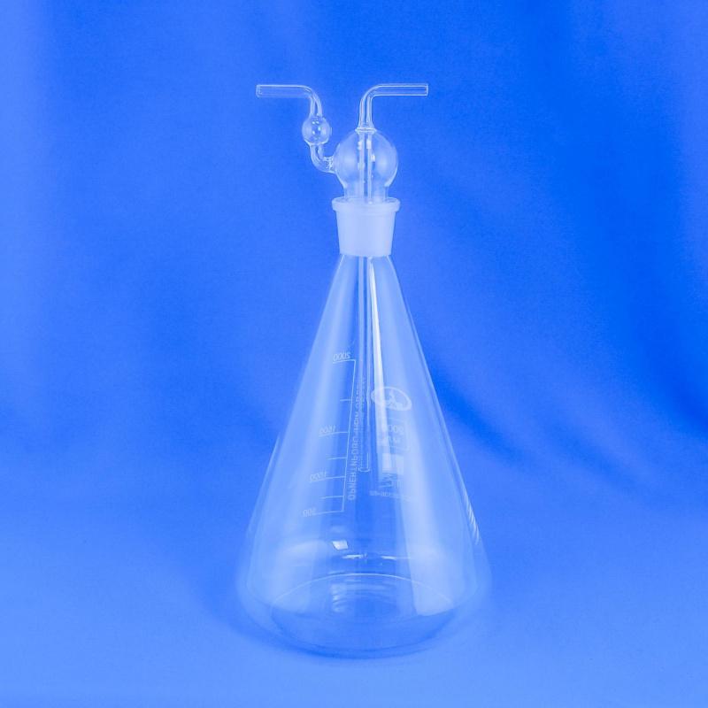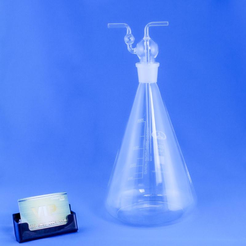 Химическая ловушка Ле-Шателье для конденсации и очистки газов на 2000 мл по своему принципу работы является увеличенной в размерах копией классической склянки Дрекселя, но в отличии от нее, имеет коническую форму и снабжена не доходящей до дна на ⅓ от высоты стеклянной трубкой, что позволяет использовать данную емкость в большем количестве химических процессов, чем классическую по форме склянку.