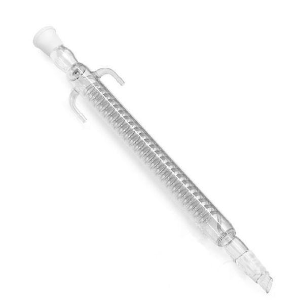 Холодильники Димрота. предназначен для эксплуатации в составе установок экстракции или сложных лабораторных систем для охлаждения жидких рабочих сред или конденсации паров. Холодильники димрота обладают высокой эффективностью и умеренным расходом охлаждающей среды. Состоит из двух основных частей: кожуха и полой спирали - холодильника. Отводные трубки расположены на одном уровне в верхней части кожуха.
