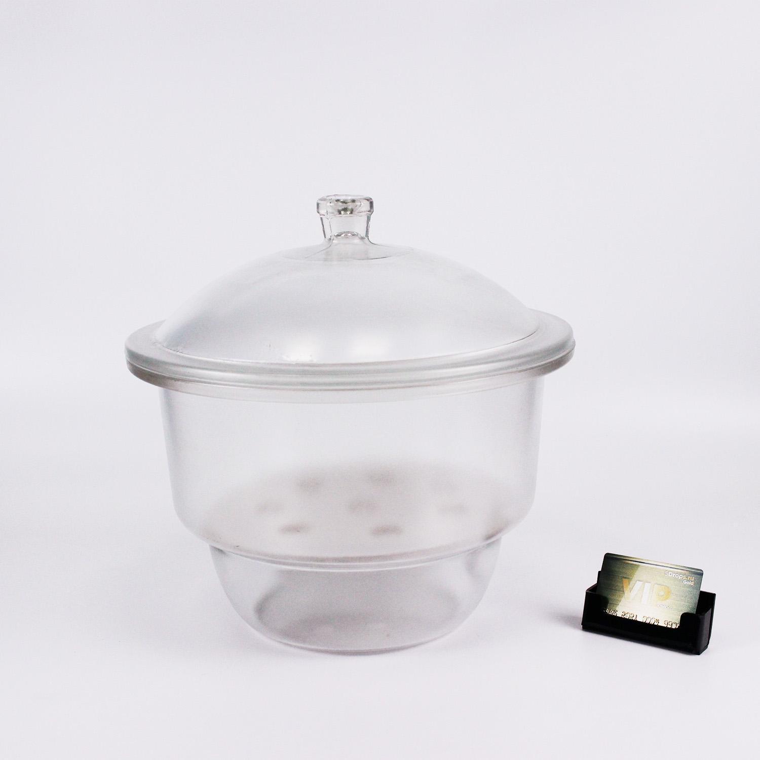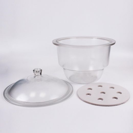 Эксикатор 5drops, светлое стекло, без крана, с керамической вставкой, 2-300 мм — предназначен для медленного высушивания и хранения гигроскопических веществ. Разработан для создания изолированной среды в объеме сосуда. В котором поддерживается близкая к нулю влажность воздуха. Эксикатор состоит из стеклянной емкости с крышкой, а также имеет решётчатый фарфоровый поддон, на который устанавливаются тигли или бюксы. Плоскость соединения с крышкой для достижения герметичности может быть смазана вакуумной смазкой.
