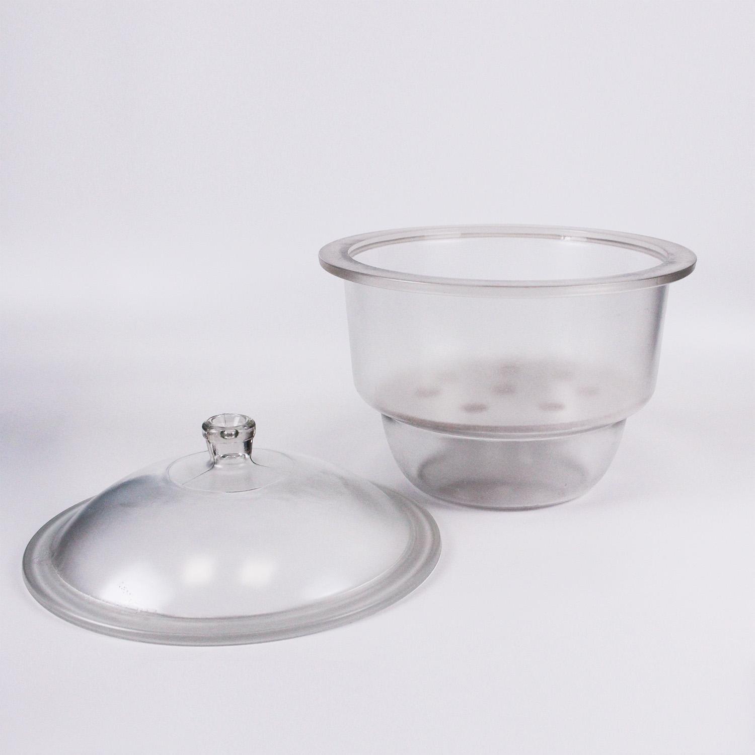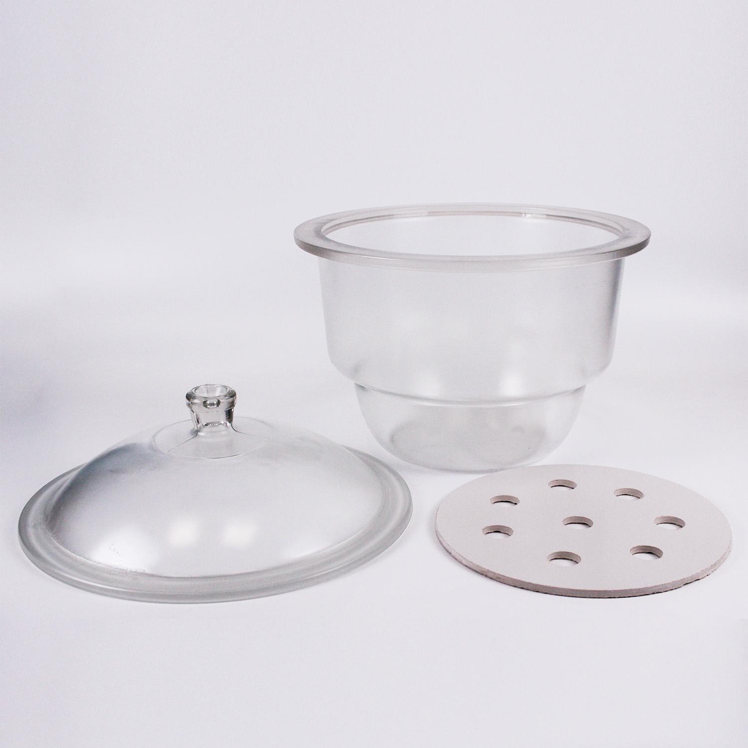 Благодаря специальным фарфоровым вкладышам внутрь посуды можно поставить тигель кварцевый, выпарные чашки, чашки Петри, бюксы и другие емкости. На дно эксикатора может быть помещен силикагель или другое гигроскопичное вещество для осушения, которое не входит в комплект поставки.