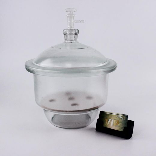 Дополнительные возможности: Внутри эксикатора находится сменный лоток, предназначенный для хлористого кальция или других влагопоглотителей. В комплект поставки также входит перфорированный диск с большими центральными отверстиями. Эксикатор можно использовать при температуре окружающей среды. Для размещения внутри горячих тиглей рекомендуется использовать фарфоровые вставки.