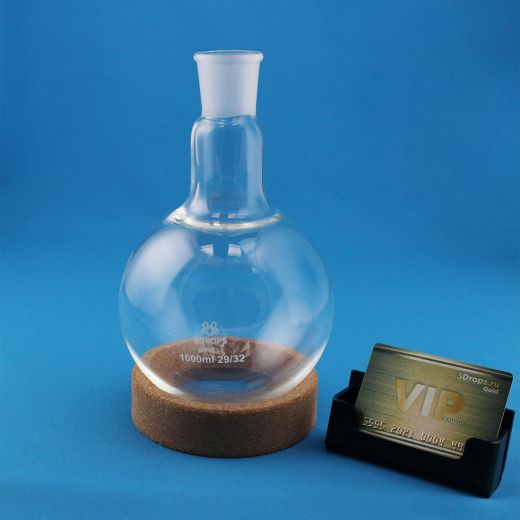 Колба круглодонная 5drops К-1-1000-29/32 со шлифом, 1000 мл. универсальная лабораторная ёмкость, пригодная для проведения разнообразных химических процессов, а также для использования в качестве небольшой перегонной колбы при проведении процесса дистилляции или дистилляции. Шарообразное дно не допускает вертикальную установку ёмкости на плоскости, но не препятствует расположению на наклонной поверхности, также для устойчивого крепления можно использовать штатив. Термостойкое химически инертное стекло, из которого изготовлена колба, допускает проводить нагрев как на электрической, так и на газовой, и даже на индукционной плите. Среди ощутимых плюсов при использовании круглодонной колбы в качестве перегонной ёмкости также следует выделить абсолютную наглядность происходящих в ней процессов, что выгодно отличает её от тех же металлических кубов