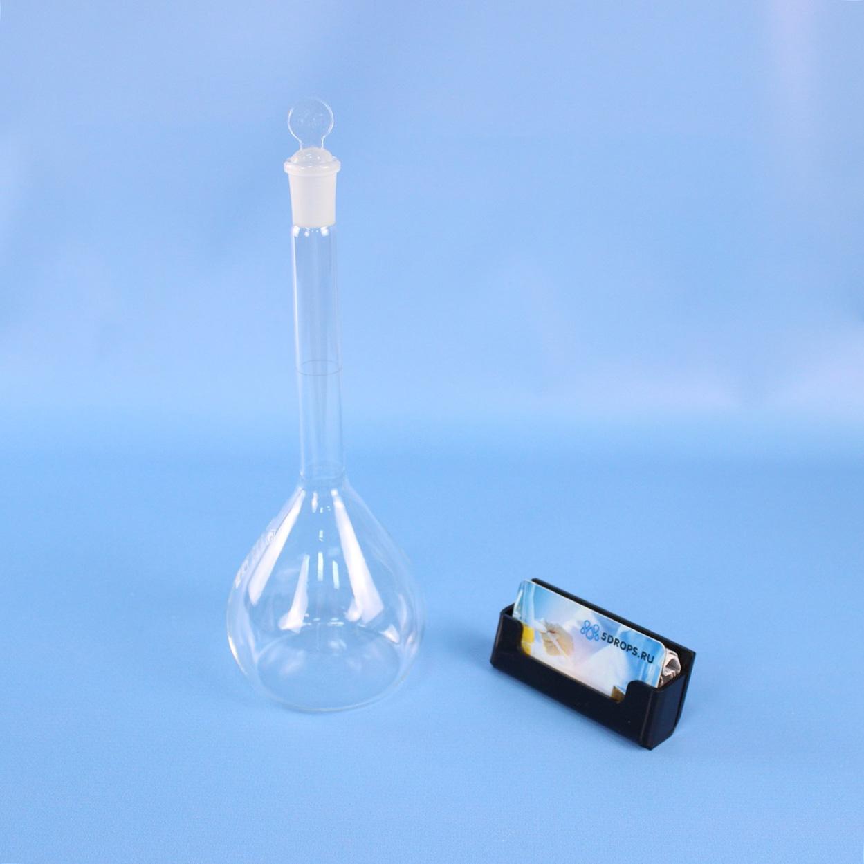 Конструкция мерной колбы, включая плоское дно, узкую горловину и точную градуировку, соответствует требованиям стандарта ГОСТ 1770-74 на лабораторную стеклянную посуду. 1-й класс точности указывает на высокий уровень точности измерений объема.