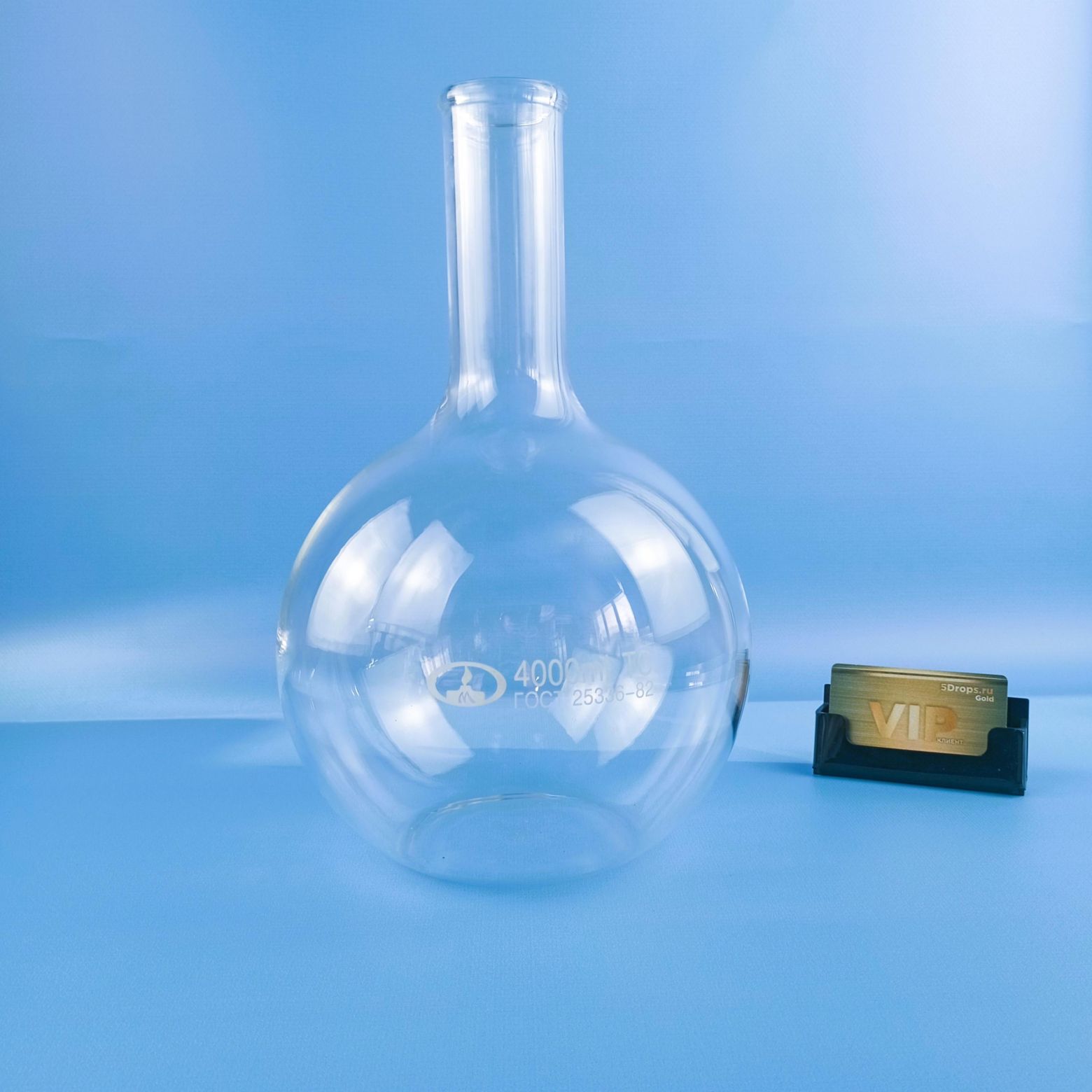 Плоскодонная стеклянная колба КП-2-4000 (без шлифа) ТС ГОСТ 25336-82 Широко используется на всех этапах физических и химических экспериментов, исследований. Для изготовления используют термостойкое стекло. Этот тип посуды применяют для: приготовления растворов, синтеза, фильтрации, дистилляции, перегонки, выпаривания, титрования при нагреве или охлаждении и как составляющая различных сложных конструкций. Благодаря своему плоскому дну отлично стоит на любой горизонтальной поверхности без вспомогательных аксессуаров. Поэтому такой тип колб ставят на магнитные мешалки, шейкеры для смешивания реактивов.Существует две модификации: со шлифом (КП-1) или без него (КП-2).  КП-2  в сравнении с КП-1 имеют более толстые стенки как в основной части так и в горле. Благодаря этому более устойчивы к физическому воздействию.  Условия эксплуатации - подобным  колбам необходим медленный и равномерный нагрев на беспламенных плитах. Не допускается установка на уже нагретую плиту, наиболее эффективный нагрев в колбонагревателе, на водяной, либо на песочной бане (в емкость с высокими стенками засыпается песок). Характеристики: Колба большого размера. Диаметр горла: 40 мм;  Объем: 4000 мл;  Материал:  стекло группы ТС (термостойкое стекло, рабочая температура до 260º С). Преимущества плоскодонных колб: Устойчивы, не нуждаются в дополнительных подставках.  Имеют большую площадь соприкосновения.  Устойчивы к агрессивным средам. Термостойкие, легко переносят медленный нагрев и охлаждение. Отсутствие шлифа позволяет подключать лабораторную посуду с нестандартными выходами через силиконовую пробку.