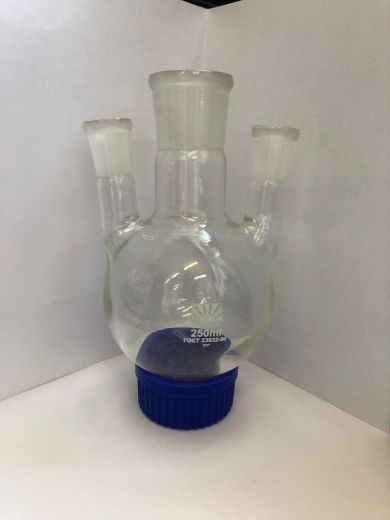 Колба трехгорлая КГП-3-1-250-29/32 на 250 мл -с круглым дном и тремя горловинами применяется для проведения химических реакций.