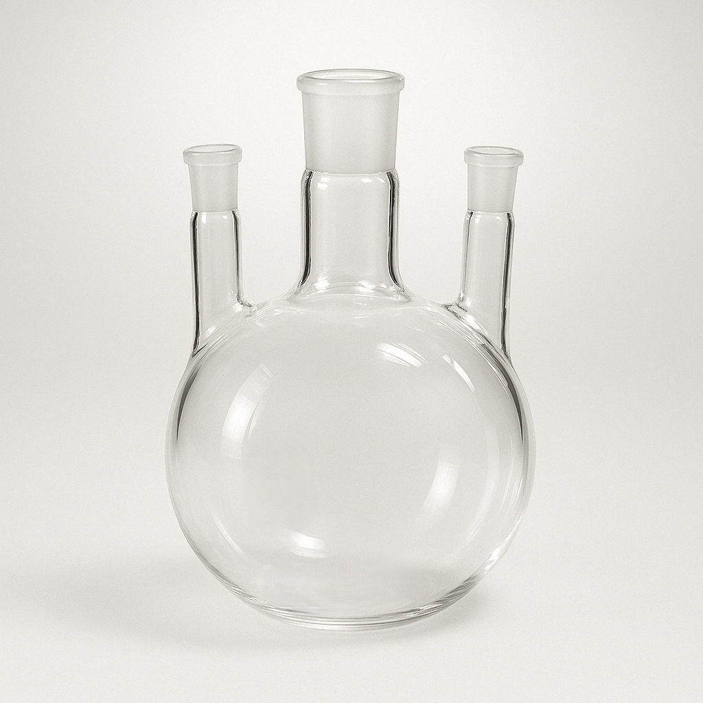 - Трехгорлая конструкция позволяет подключать различные приборы, такие как реакторные установки, трубки, воронки или отводы, обеспечивая удобство при проведении многокомпонентных химических реакций