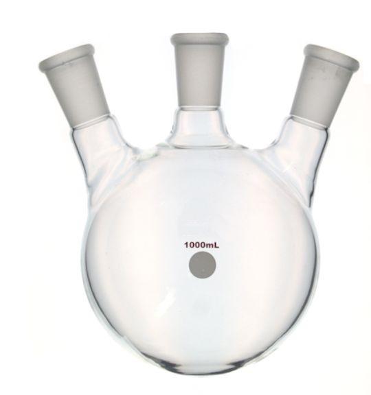 Колба трехгорлая КГУ-3-1- 1000-29/32 на 2000 мл с  угловыми шлифами выполнены из термостойкого и химически стойкого стекла. Предназначены для проведения химических процессов (реакций) при нагревании (в том числе кипении), охлаждении, вакууме и небольшом избыточном давлении. Колба применяется в различных отраслях для широкого диапазона работ, однако, как правило, трехгорлые колбы-реакторы используют в органическом синтезе.