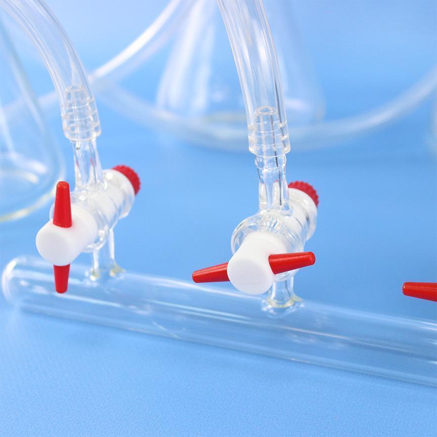 — Стеклянный вакуумный коллектор, 4 выхода на 10 мм - предназначен для равномерного распределения вакуума. Оснащен четырьмя выходами с фторопластовыми кранами, позволяющими одновременно фильтровать четыре образца.