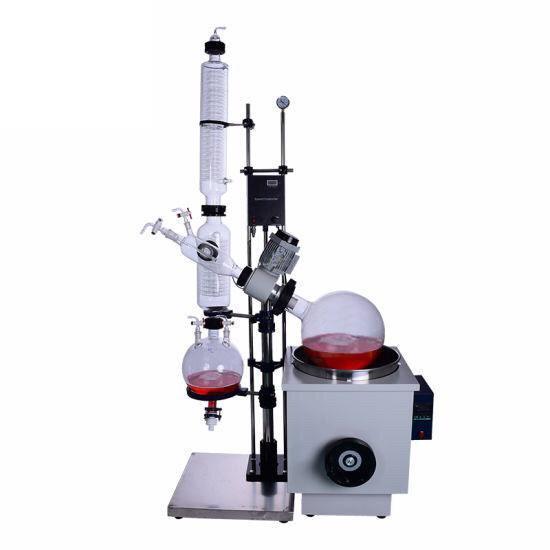 В конструкции ротационного испарителя имеется электродвигатель, который вращает колбу, и водяная баня для нагрева колбы. Пары растворителя поступают в обратный холодильник, где охлаждаются и конденсируются, накапливаясь в приёмной колбе. Для подключения вакуумного насоса в системе ротационного испарителя предусмотрен кран, который также часто применяется для впуска в систему инертного газа (аргона или азота).