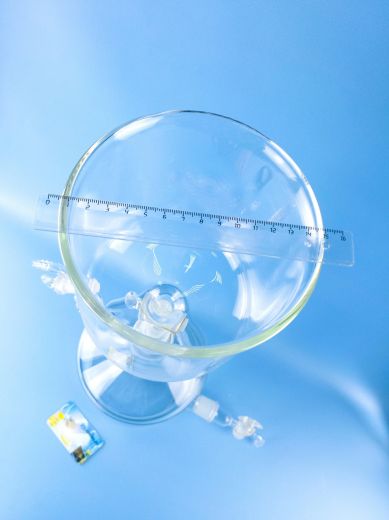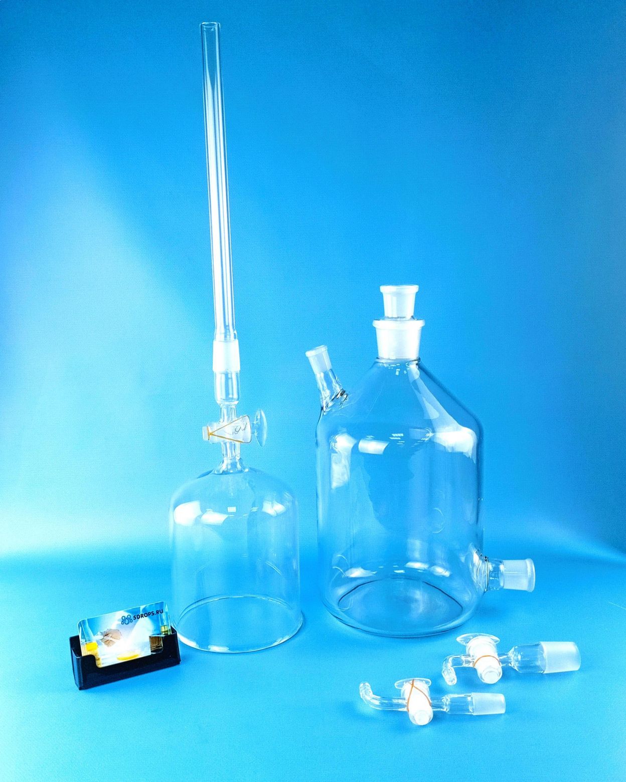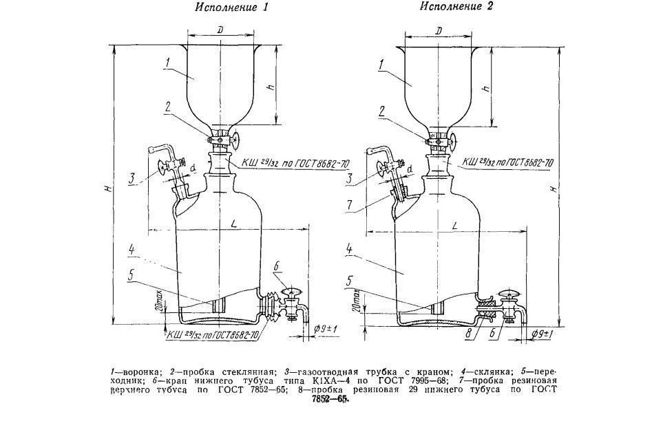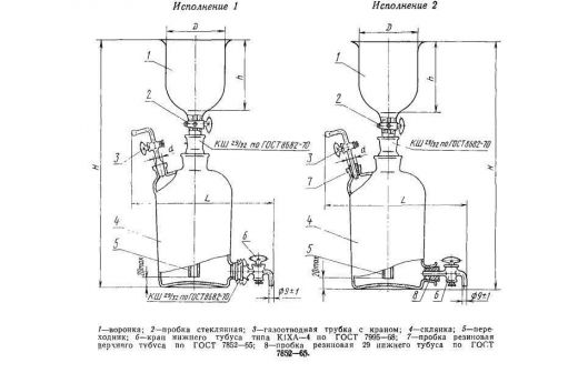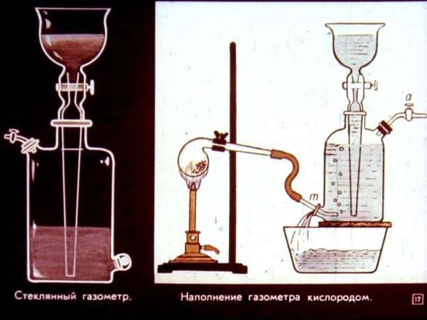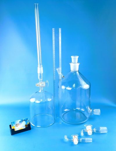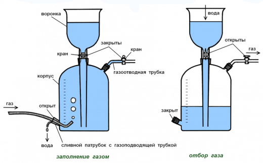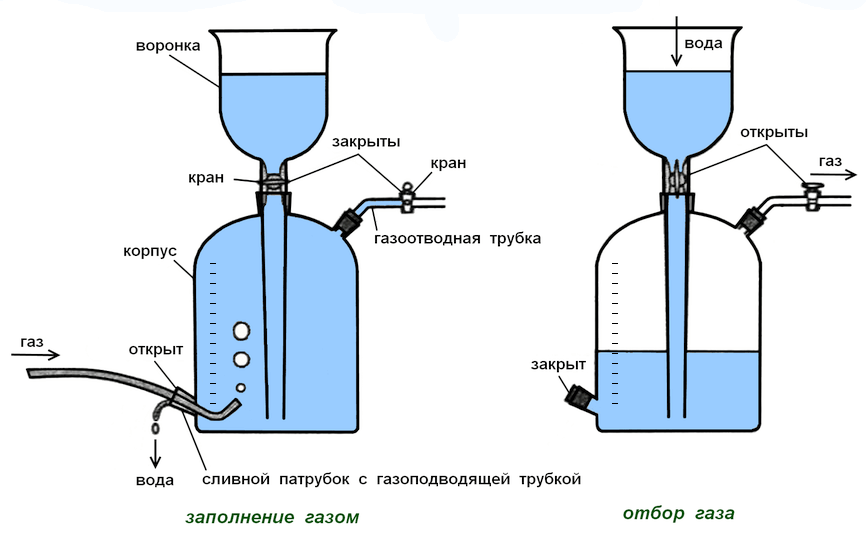 Склянка-газометр на 5 л. Лабораторный прибор для собирания и хранения газов, а также приблизительной оценки их объёмов. Представляет собой изготавливаемый из толстого стекла вместимостью до 5 литров. Предназначен для хранения и выдачи газа под давлением, незначительно превышающим атмосферное. Дозаправка газометра не допускается во избежание случайного смешения остатков старого газа с новым, например, водорода с кислородом. Перед каждой новой заправкой следует убедиться в полном заполнении газометра водой. Не рекомендуется заполнять газометры горючими газами (водородом, метаном, ацетиленом и т. д.), способными образовывать взрывоопасные смеси с воздухом.