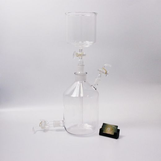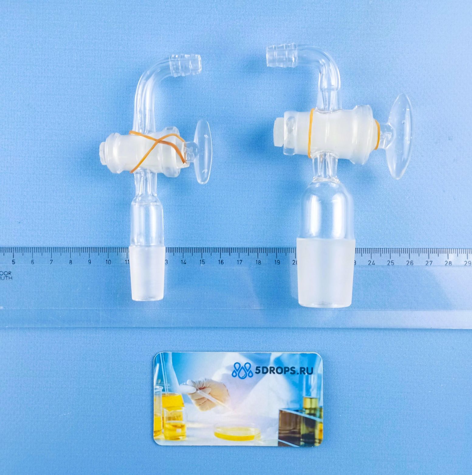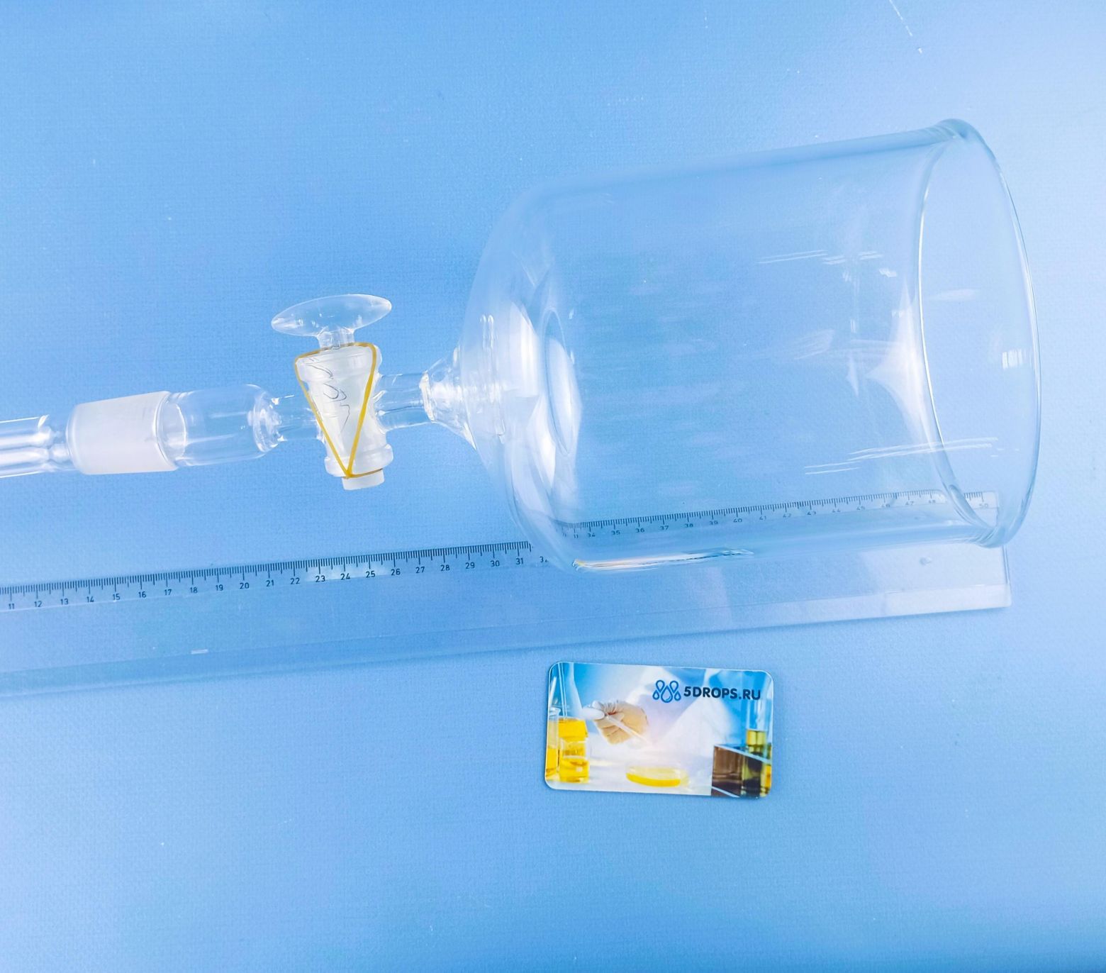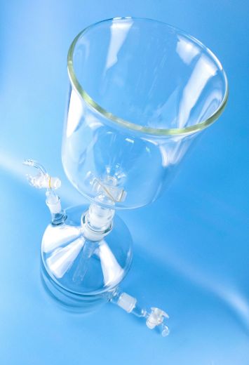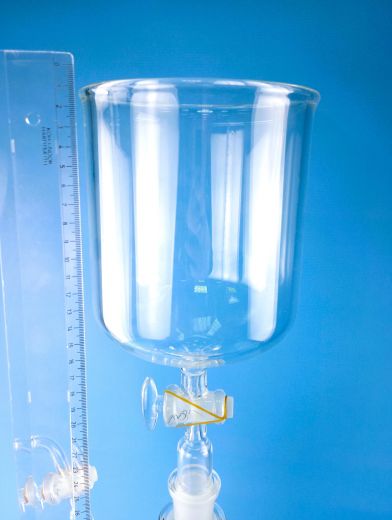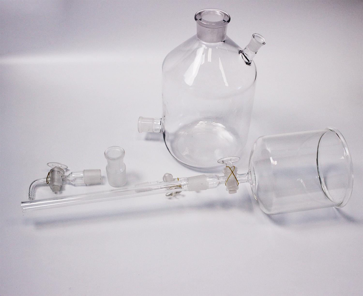 Склянка-газометр на 5 л. Лабораторный прибор для собирания и хранения газов, а также приблизительной оценки их объёмов. Представляет собой изготавливаемый из толстого стекла вместимостью до 5 литров. Предназначен для хранения и выдачи газа под давлением, незначительно превышающим атмосферное. Дозаправка газометра не допускается во избежание случайного смешения остатков старого газа с новым, например, водорода с кислородом. Перед каждой новой заправкой следует убедиться в полном заполнении газометра водой. Не рекомендуется заполнять газометры горючими газами (водородом, метаном, ацетиленом и т. д.), способными образовывать взрывоопасные смеси с воздухом.