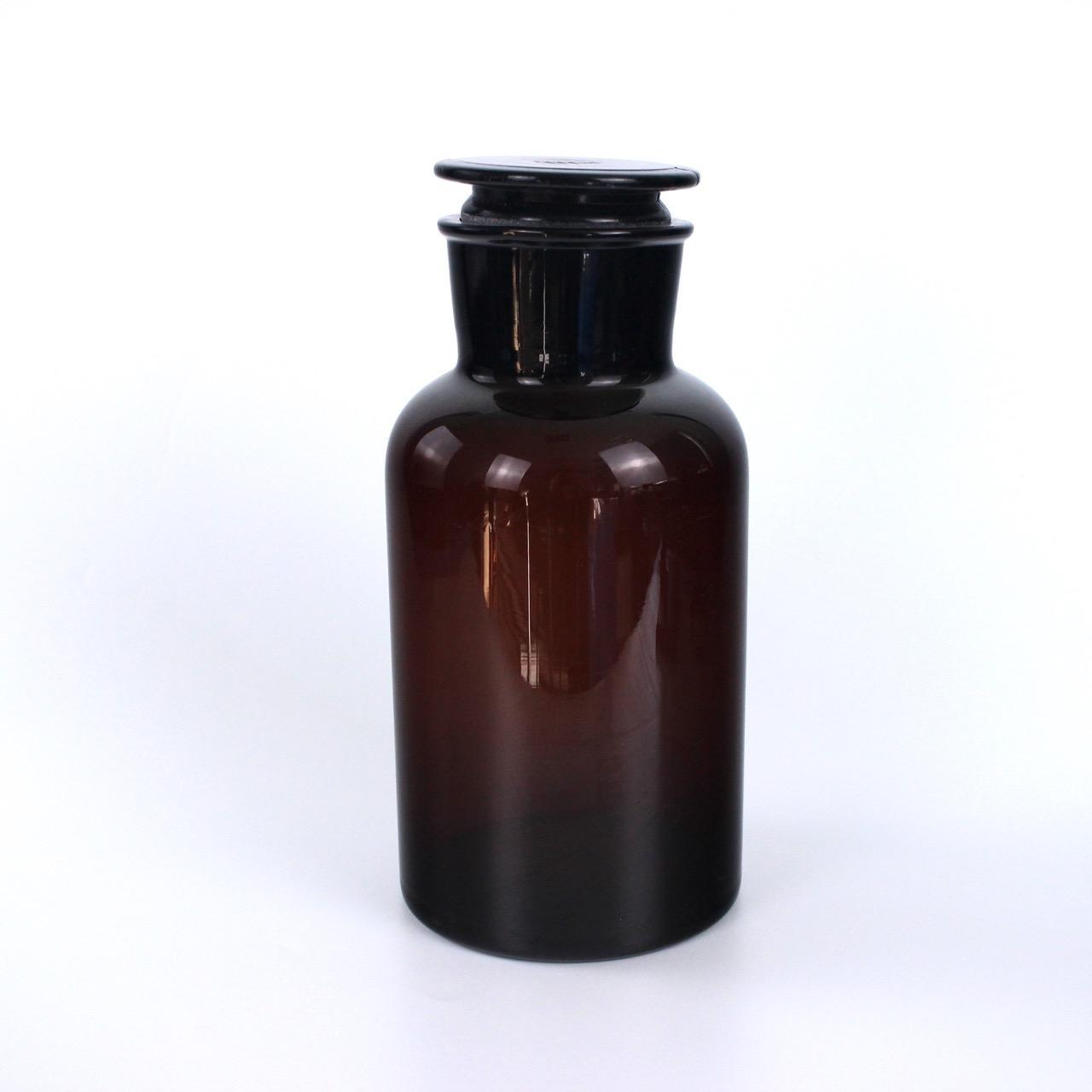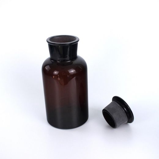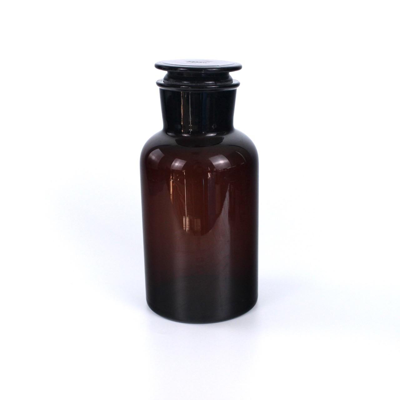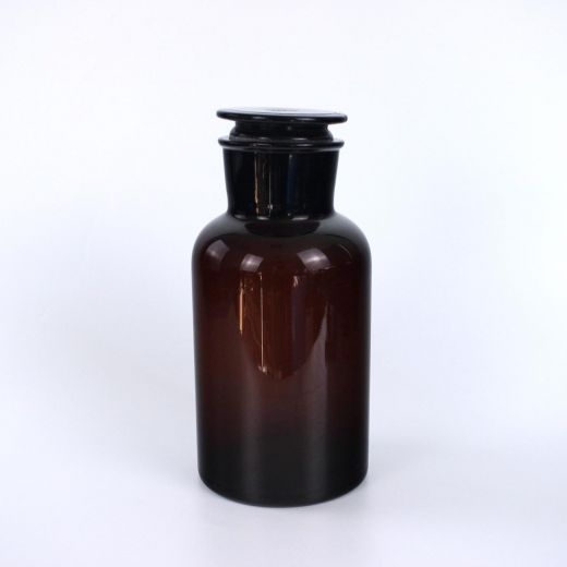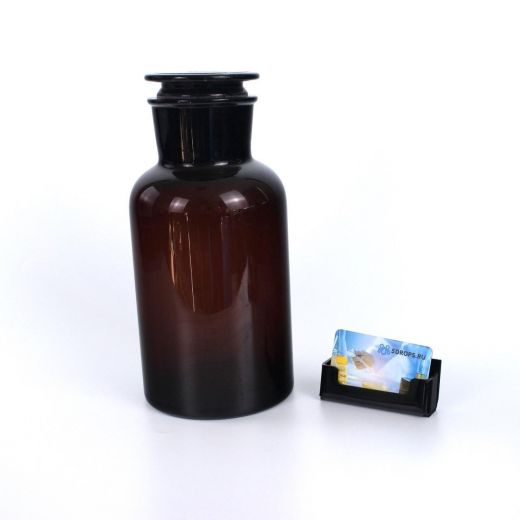 Склянка для реактивов широкое горло из специального  двойного лабораторного тёмного стекла. Отличается термической и химической стойкостью. Коэффициент температурного расширения применяемого стекла НС-1 почти в 10 раз ниже, чем у обычного, что позволяет стеклу не трескаться при резких изменениях температуры. Помимо этого "янтарное" стекло обеспечивает практически 100% защиту от ультрафиолетового излучения. Представленная ёмкость выгодно отличается от прочих химических бутылей надёжной и практичной стеклянной притёртой пробкой, плотно закупоривающей горло, что обеспечивает полную герметичность, а также удобство при открытии или закрытии склянки. Тара расчитана для длительного хранения химических реактивов, в том числе фотофобных, летучх, фотолабильных и пахучих.