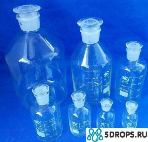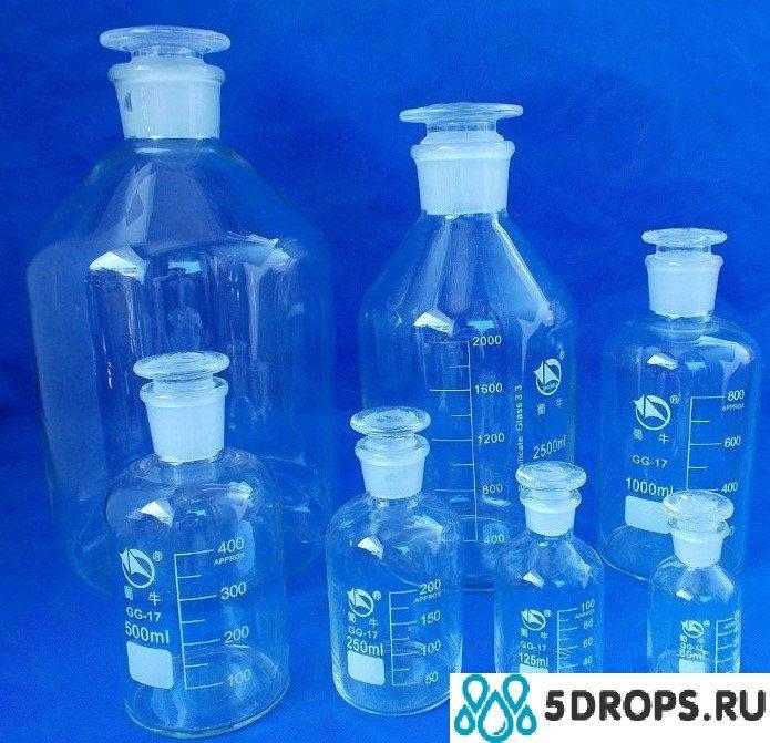 Склянка для реактивов узкое горло из специального  двойного лабораторного светлого стекла. Отличается термической и химической стойкостью. Коэффициент температурного расширения применяемого стекла ниже, чем у обычного, что позволяет стеклу не трескаться при резких изменениях температуры.  Представленная ёмкость выгодно отличается от прочих химических бутылей надёжной и практичной стеклянной притёртой пробкой, плотно закупоривающей горло, что обеспечивает полную герметичность, а также удобство при открытии или закрытии склянки. Тара расчитана для длительного хранения химических реактивов, в том числе летучх, фотолабильных и пахучих веществ