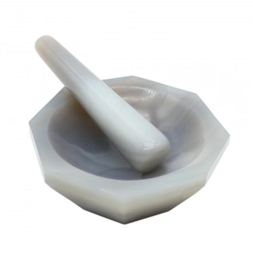 Ступка агатовая, внутр.диаметр 120 мм, с пестом. Агатовые ступки предназначены для измельчения путем истирания сухих порошков и различных суспензий, а также для смешивания небольших количеств веществ, используемых для различных научных исследований. Проба, измельчаемая в агатовой ступке, не загрязняется нежелательными примесями, что особенно важно, например, для ИК-спектроскопии. Агат - минерал, скрытокристаллическая разновидность кварца, представляет собой тонковолокнистый агрегат халцедона со слоистой текстурой и полосчатым распределением окраски. Непрозрачен, просвечивает в краях. В большинстве агатов чередуются слои халцедона и его структурной разновидности - кварцина (лютецина), отличающейся от халцедона направлением удлинения волокон. Визуально слои кварцина обычно выделяются молочно-белой окраской. Агат по цвету очень разнообразен. Если с белыми слоями чередуются слои жёлтого, красного, бурого, чёрного или другого цвета, то такая разновидность может иметь собственное название. Для изготовления агатовых ступок используется бразильский агат: чередование темно-серых и светлых слоёв или ровный цвет, чаще всего серо-голубой. Реже встречаются ступки белые или очень темные.