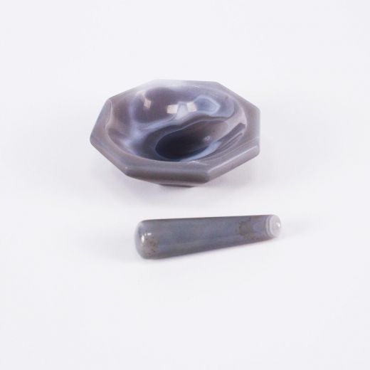 Ступка агатовая 70 мм с пестом. Агатовые ступки предназначены для измельчения путем истирания сухих порошков и различных суспензий, а также для смешивания небольших количеств веществ, используемых для различных научных исследований. Проба, измельчаемая в агатовой ступке, не загрязняется нежелательными примесями, что особенно важно, например, для ИК-спектроскопии. Агат - минерал, скрытокристаллическая разновидность кварца, представляет собой тонковолокнистый агрегат халцедона со слоистой текстурой и полосчатым распределением окраски. Непрозрачен, просвечивает в краях. В большинстве агатов чередуются слои халцедона и его структурной разновидности - кварцина (лютецина), отличающейся от халцедона направлением удлинения волокон. Визуально слои кварцина обычно выделяются молочно-белой окраской. Агат по цвету очень разнообразен. Если с белыми слоями чередуются слои жёлтого, красного, бурого, чёрного или другого цвета, то такая разновидность может иметь собственное название. Для изготовления агатовых ступок используется бразильский агат: чередование темно-серых и светлых слоёв или ровный цвет, чаще всего серо-голубой. Реже встречаются ступки белые или очень темные.