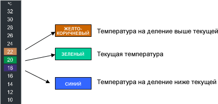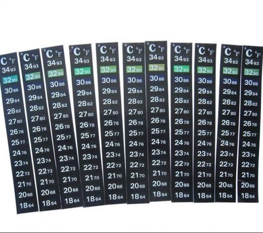 Наклейка имеет 2 цветные температурные шкалы - Цельсия °C и Фаренгейта °F, измеряемый термометром диапазон от +18°С до +34°С и от +64 °F до 93 °F. Показания текущей температуры располагаются в прямоугольнике зеленого цвета. Если зеленый цвет на термометре отсутствует, то текущая температура — среднее между значениями на синем и коричневом прямоугольнике (см. рис.). Влагостойкая цветная  ЖК шкала позволяет легко снимать показания с термометра даже людям со слабым зрением. Показания термометра видно при хорошем освещении, поэтому необходимо подсветить его, если в помещении приглушенный свет.