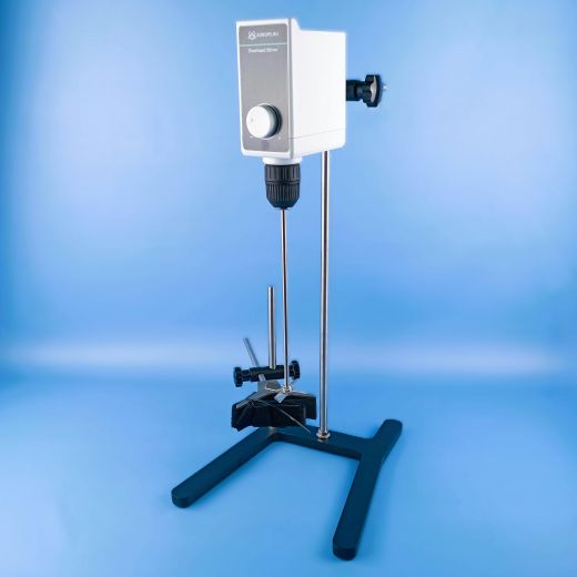 Верхнеприводная мешалка 5drops-OS-10, до 10 литров, максимальная вязкость 10000 МПа предназначена для равномерного механического перемешивания, гомогенизации текучих и вязких жидкостей, размешивания твердых частиц в жидкостях, приготовления суспензий, гелей, эмульсий, а также для внедрения газов. При использовании верхнеприводных мешалок — правильное соотношение размера емкости с параметрами перемешивающего элемента. Диаметр сосуда должен в два раза превышать диаметр перемешивающего элемента, а высота в два-три раза его высоту. В случае высоковязкого материла перемешивающий элемент должен находиться ближе к стенке сосуда. Верхнеприводная погружная мешалка состоит из привода и насадки. Привод – это электронно-механическое устройство, вращающее стержень (вал). На стержне расположена перемешивающая насадка (мешальник), которая удерживается специальным зажимом. Именно она контактирует с содержимым емкости и перемешивает его. Задачу гомогенизации химически активных веществ можно решать и с помощью других шейкеров. Механические двигатели у этого оборудования используются редко. Обычно, вращение насадки выполняет электрический мотор, а мешальники могут иметь конструкцию разных видов.