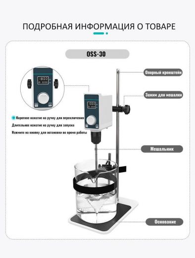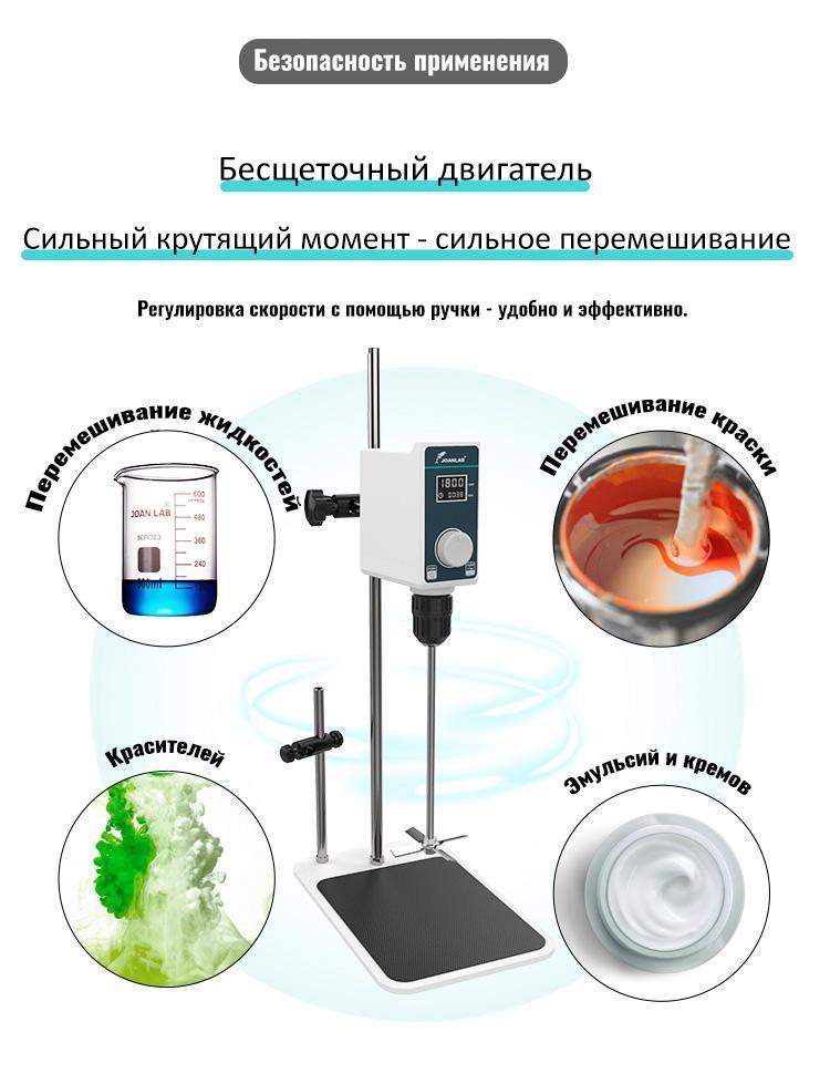 - Мешалка рассчитана на работу с объемами до 20 литров воды, что позволяет использовать ее для масштабных лабораторных процессов.
