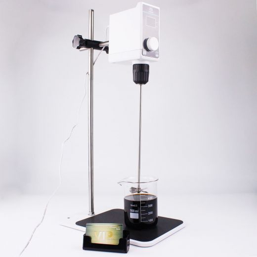 Верхнеприводная мешалка 5drops-OSS-30, с цифровым дисплеем, до 20 литров, максимальная вязкость 16000 Мпа предназначена для равномерного механического перемешивания, гомогенизации текучих и вязких жидкостей, размешивания твердых частиц в жидкостях, приготовления суспензий, гелей, эмульсий, а также для внедрения газов. При использовании верхнеприводных мешалок — правильное соотношение размера емкости с параметрами перемешивающего элемента. Диаметр сосуда должен в два раза превышать диаметр перемешивающего элемента, а высота в два-три раза его высоту. В случае высоковязкого материла перемешивающий элемент должен находиться ближе к стенке сосуда. Верхнеприводная погружная мешалка состоит из привода и насадки. Привод – это электронно-механическое устройство, вращающее стержень (вал). На стержне расположена перемешивающая насадка (мешальник), которая удерживается специальным зажимом. Именно она контактирует с содержимым емкости и перемешивает его. Задачу гомогенизации химически активных веществ можно решать и с помощью других шейкеров. Механические двигатели у этого оборудования используются редко. Обычно, вращение насадки выполняет электрический мотор, а мешальники могут иметь конструкцию разных видов.