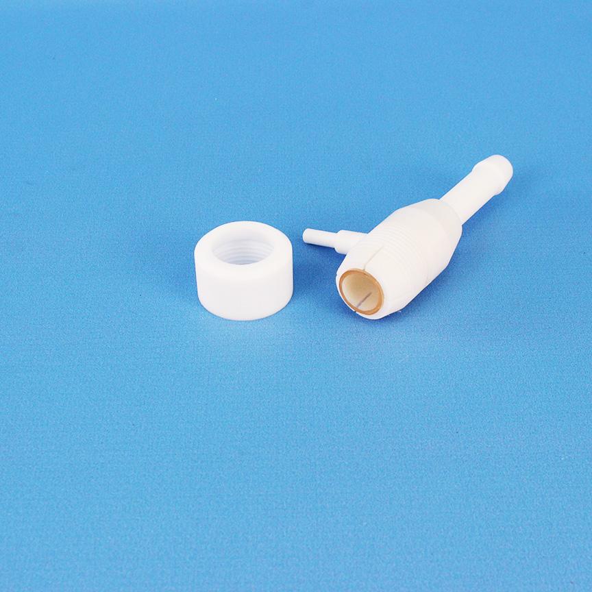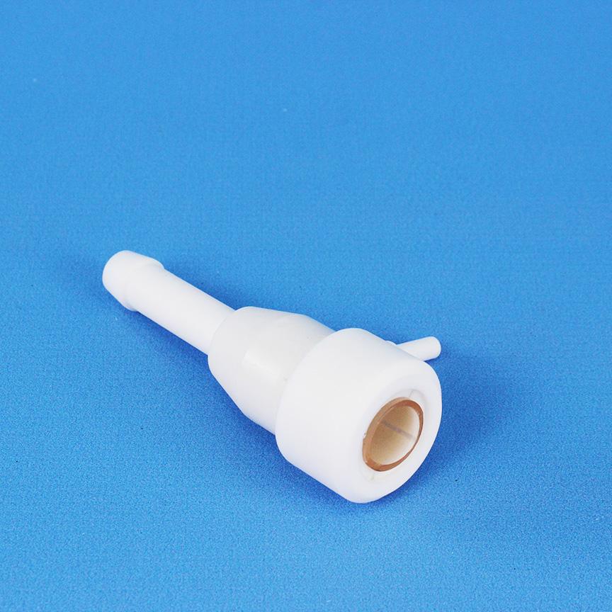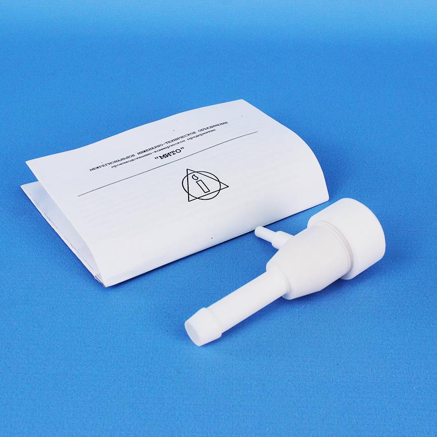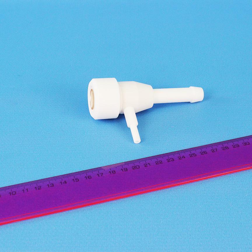Водоструйный насос НВФ-2, фторопласт. предназначен для создания предельного остаточного давления в системе или обычного вакуума. Действие насоса основано на том, что давление жидкости, протекающей по трубе, при уменьшении её диаметра снижается, но скорость движения струи возрастает. Вода, проходя через суживающееся сопло с большой скоростью, создает разряжение, увлекая окружающий воздух в направлении течения струи и выводя его наружу. Основное достоинство водоструйных насосов из фторопласта - надежность и долговечность. Основные параметры насоса при давлении воды не менее 3 кгс/см2 и температуре (8±1)°С должны быть: - предельное остаточное давление - не более 0,01356 кгс/см2 (мм рт.ст.); - время установления предельного остаточного давления в сосуде номинальной вместимостью 1000 мл - не более 6 мин. Фторопластовый водоструйный насос может стать бюджетным решением для тех, кто хочет собрать свою лабораторную вакуумную установку, состоящую из колбы Бунзена и воронки Бюхнера. Обычный электрический вакуумный насос достаточно дорог и способен создавать очень большое давление в системе, которое зачастую не требуется для проведения фильтрации жидкостей через обычный бумажный обеззоленный фильтр. Для работы насоса необходимо только его подключение к водопроводной воде, надев его непосредственно на кран.