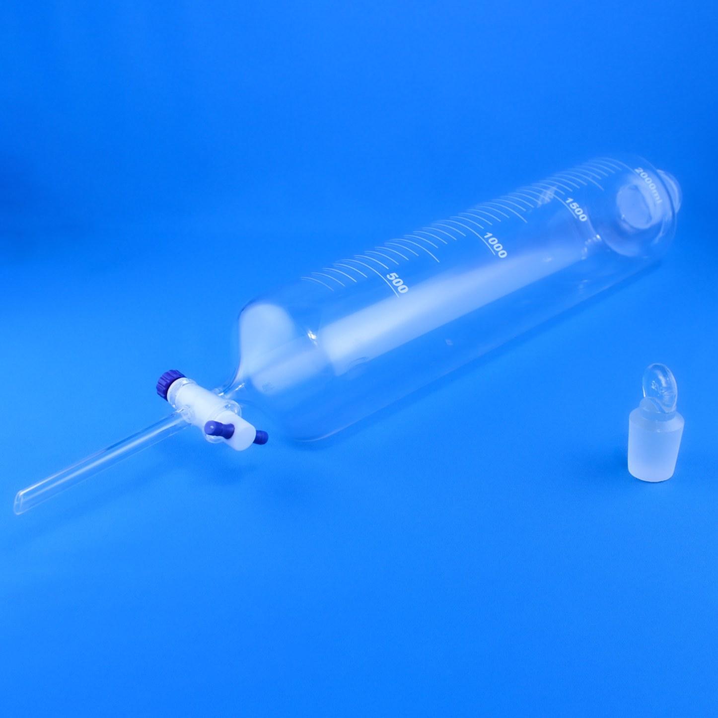 Воронка делительная ВД-1-2000 цилиндрическая 2000мл с фторопластовым краном ISO 4800 - предназначена для разделения несмешивающихся жидкостей в процедурах экстрагирования. Изготовлена из химико-лабораторного стекла.
