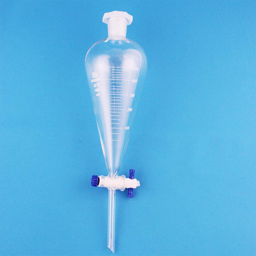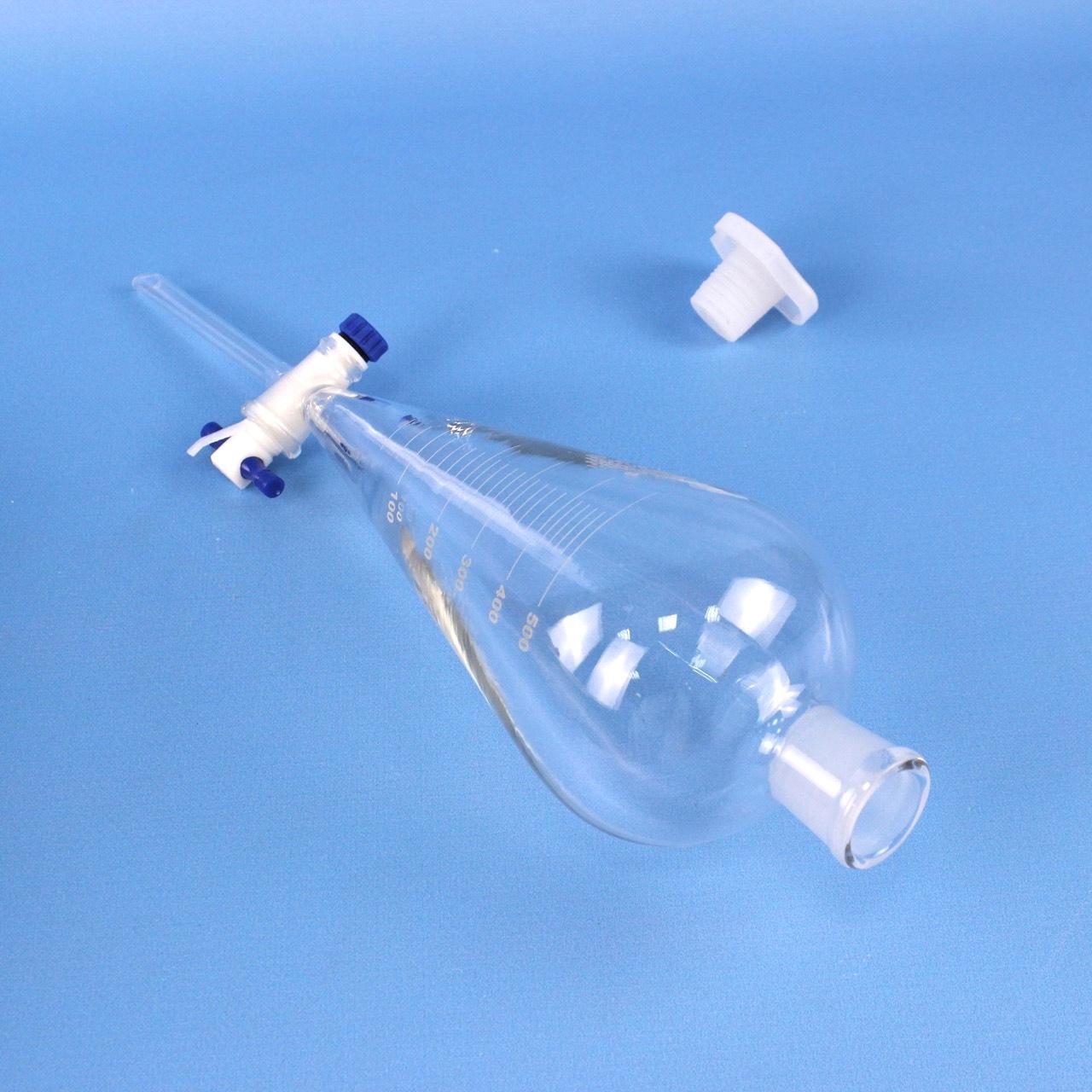 Воронка делительная грушевидная 5drops ВД-3-500, 500 мл, с делениями, с фторопластовым краном - незаменимый прибор для любой лаборатории, проводящей экстракцию жидкость-жидкость или разделение смесей. Воронка имеет грушевидную форму для улучшения процесса разделения, полиэтиленовую (ПЭ) пробку для надежного уплотнения и запорный кран из ПТФЭ для точного контроля над потоком жидкости.