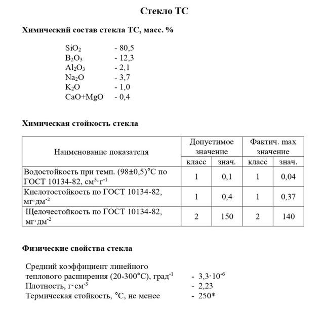 - Стекло ТС (и его иностранный аналог Boro 3.3) имеет термостойкость до 250°C, что позволяет использовать его в аналитической химии, органическом синтезе и автоклавах, где важна высокая надежность.