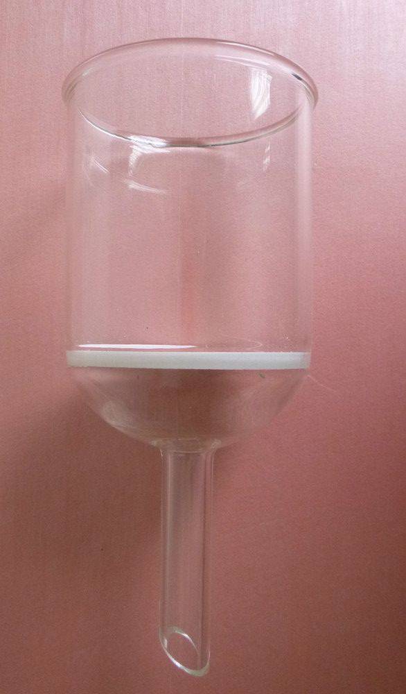Воронка фильтровальная лабораторная (Шотта), диаметр 90 мм, пор. 250 мкм, без шлифа - специальный элемент лабораторный посуды, используемый для вакуумного фильтрования химически активных жидкостей, а также для их очистки от взвешенных примесей . Наличие впаянного в корпус воронки стеклянного фильтра из спечённого стекла позволяет не использовать в процессе фильтрации беззольные фильтры. Кроме того, материал изготовления воронки - лабораторное термостойкое стекло позволяет фильтровать особо агрессивные концентрированные вещества без взаимодействия с ними. Помимо применения в химии воронку очень удобно использовать для фильтрации браги или уже готового продукта в процессе его очистки углем. В зависимости от фракции взвешенных в напитке частиц можно выбрать воронку с более или менее крупными порами.