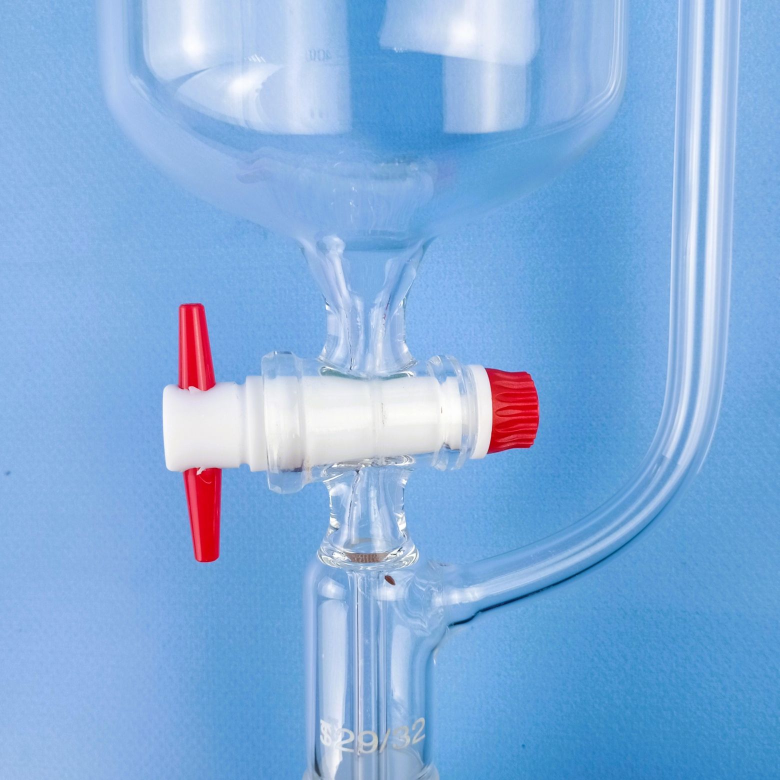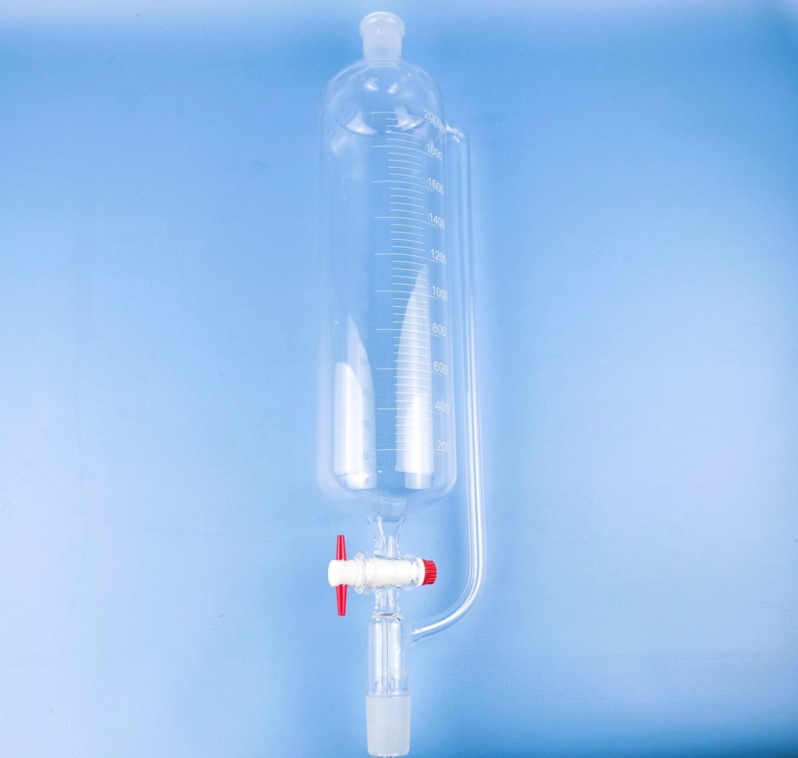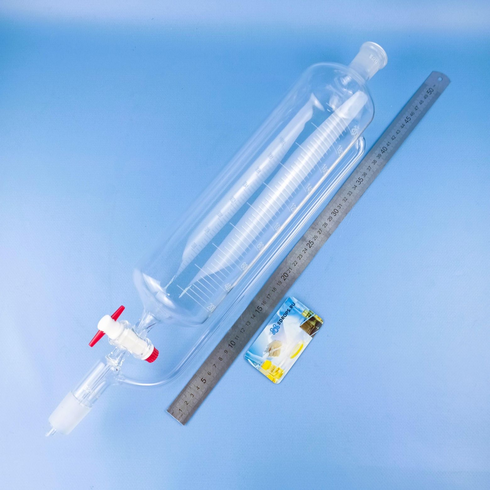 Воронка капельная цилиндрическая 5drops, ВД-2-2000 шлиф 29/32, с компенсатором давления, на 1000 мл. Воронка капельная применяется для разделения жидких несмешивающихся веществ разной плотности, она используются если необходимо достаточно медленно ввести жидкость на дно каких-либо сосудов. Ее часто применяют если ведётся работа с малыми дозами веществ. Изготовлена из стекла способного переносить воздействие большинства химических соединений, включая кислоты и неконцентрированные щелочи. Благодаря наличии компенсатора давления вы сможете добавлять различные жидкости в очень плотно закрытые ёмкости. Компенсатор давления представляет собой трубку, расположенную в боковой части воронки. Предназначена для для сброса избыточного газа из колбы после слива в нее нижней более тяжелой жидкости, когда следует изолировать ее от воздействия воздуха. Капельные воронки бывают грушевидной или цилиндрической формы.