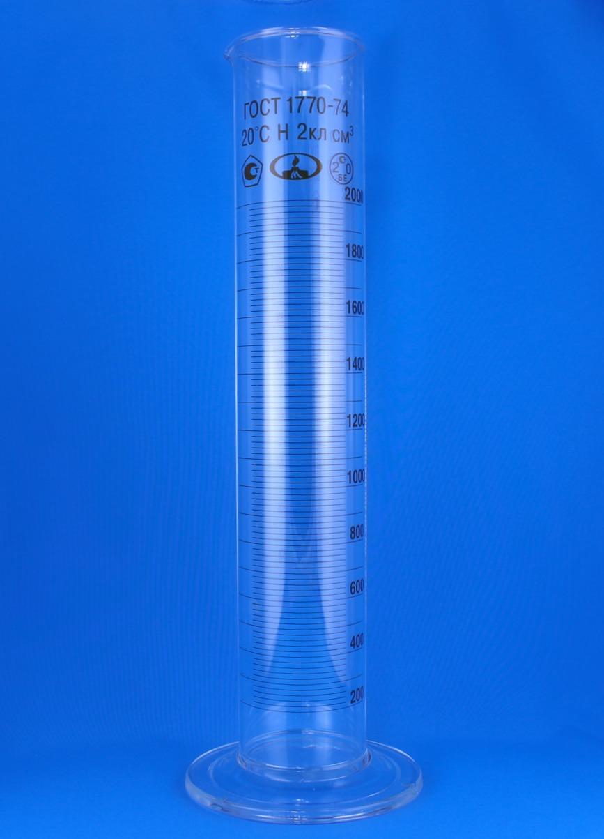 Цилиндр мерный 1-2000-2, 2000 мл, со стеклянным основанием, с носиком предназначены для отмеривания жидкостей методом налива (т.е. нужный объем будет в цилиндре; при переливании в другую посуду следует учесть потери жидкости на смачивание стенок цилиндра). Цилиндр изготовлен по ТУ 9464-013-52876351-2014 из химико-лабораторного стекла по ГОСТ 21400. Исполнение 1, класс точности 2. Нанесенная шкала коричневого или белого цветов устойчива к высоким температурам и ко многим химическим веществам.