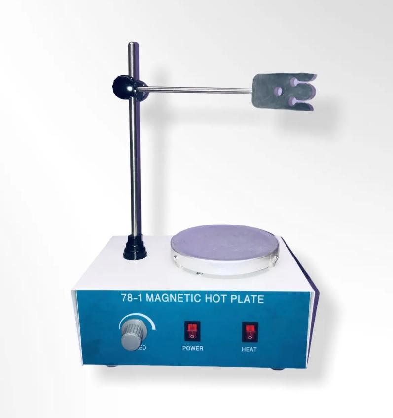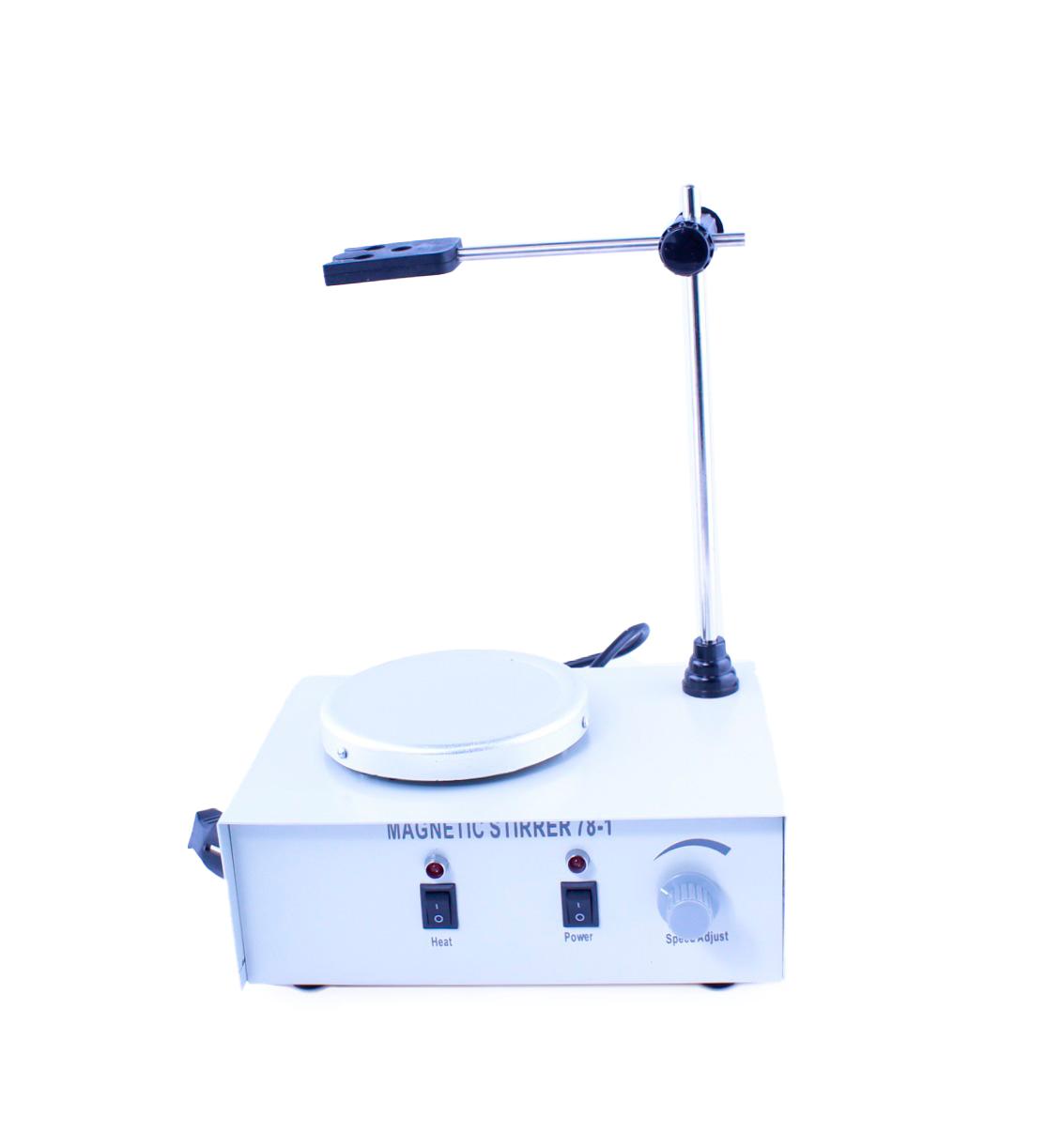 Магнитная мешалка на 2 литра с подогревом и штативом представляет собой электронно-механическое устройство, которое обеспечивает выполнение операций по смешиванию реагентов при заданной постоянной скорости вращения магнитного якоря, помещенного в сосуд с жидкостью, а также возможность проводить равномерный нагрев любой лабораторной термостойкой посуды, помещённой на круглую платформу до 120°С. Представленная модель оборудована штативом для поддержания отдельных частей сложной лабораторной конструкции. Помимо лабораторного использования магнитные мешалки, расчитанные на перемешивание больших объёмов жидкостей (5, 10 литров), могут быть использованы в быту при производстве домашних алкогольных напитков или браги, требующих регулярного перемешивания без нарушения герметичности их хранения, а также при перемешивании жидкости внутри узкогорлых бутылей.
