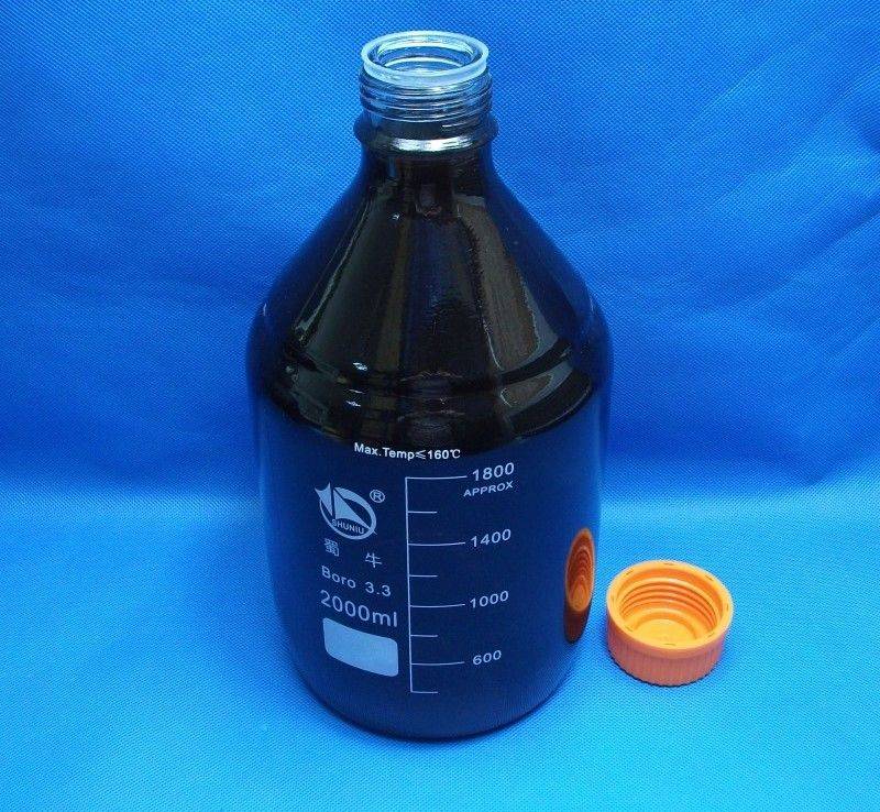 Бутыль 2000 мл с винтовой крышкой из качественного двойного лабораторного тёмного стекла. Отличается термостойкостью и химической стойкостью. Коэффициент температурного расширения применяемого стекла НС-1 почти в 10 раз ниже, чем у обычного, что позволяет стеклу не трескаться при резких изменениях температуры. Помимо этого "янтарное" стекло обеспечивает практически 100% защиту от ультрафиолетового излучения. Представленная ёмкость выгодно отличается от прочих химических бутылей надёжной и практичной винтовой крышкой с пластиковой прокладкой, что обеспечивает полную герметичность, а также удобство при открытии и закупорке банки.