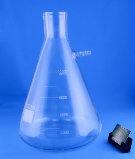 Колба Бунзена 5drops-10 000, Boro 3.3, на 10 000 мл, без шлифа - предназначена для фильтрования под пониженным давлением, с применением вакуумного насоса. В горловину вставляют воронку Бюхнера или Шотта. Благодаря шлифованной горловине соблюдается герметичное соединение. К тубусу подсоединяют трубку. Воронку примерно наполовину заполняют фильтруемым веществом. Насос создает в колбе разрежение, и жидкость из воронки поступает в сосуд.