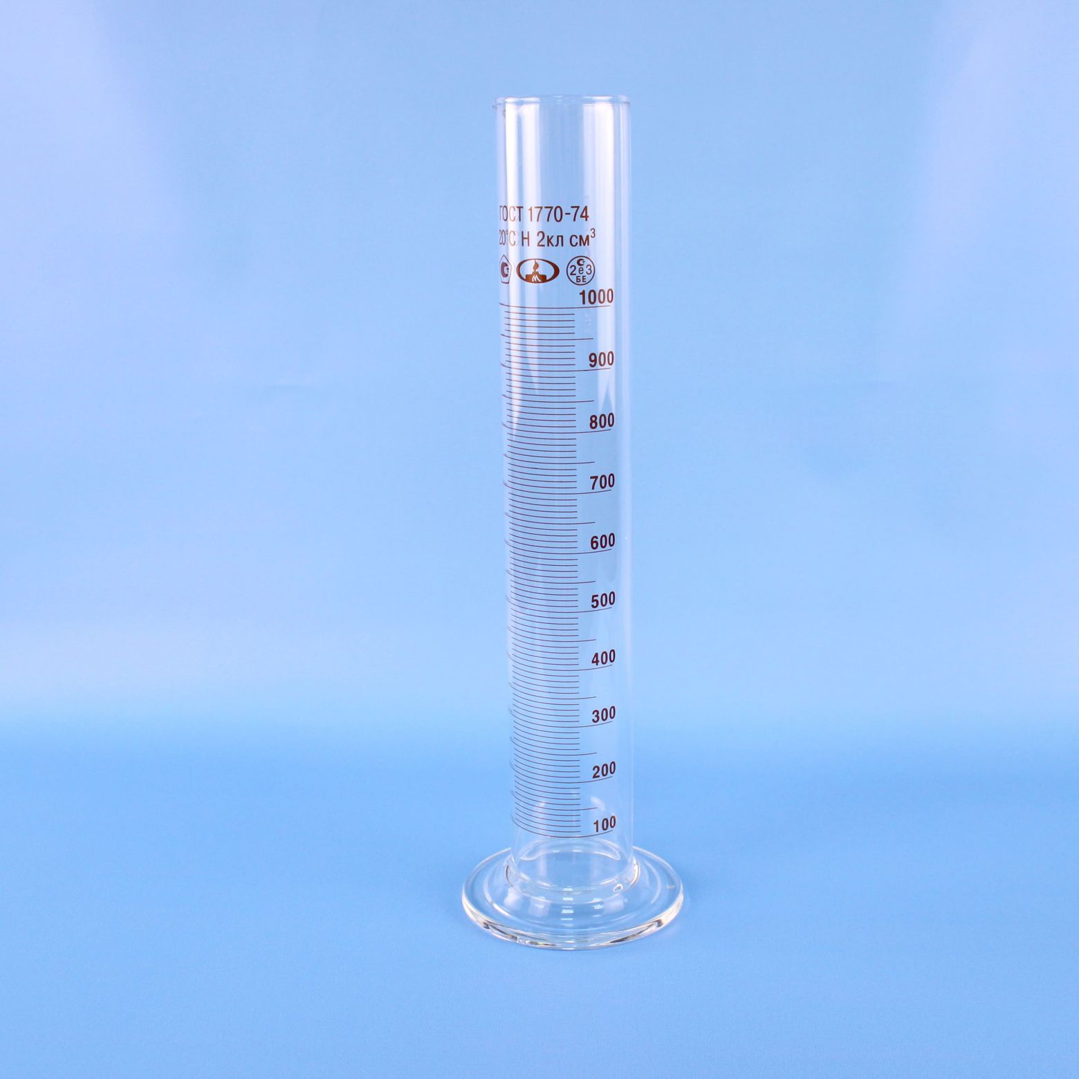 Цилиндр мерный 1-1000-2, 1000 мл, со стеклянным основанием предназначены для отмеривания жидкостей методом налива (т.е. нужный объем будет в цилиндре; при переливании в другую посуду следует учесть потери жидкости на смачивание стенок цилиндра). Цилиндр изготовлен по ТУ 9464-013-52876351-2014 из химико-лабораторного стекла по ГОСТ 21400. Исполнение 1, класс точности 2. Нанесенная шкала коричневого или белого цветов устойчива к высоким температурам и ко многим химическим веществам.