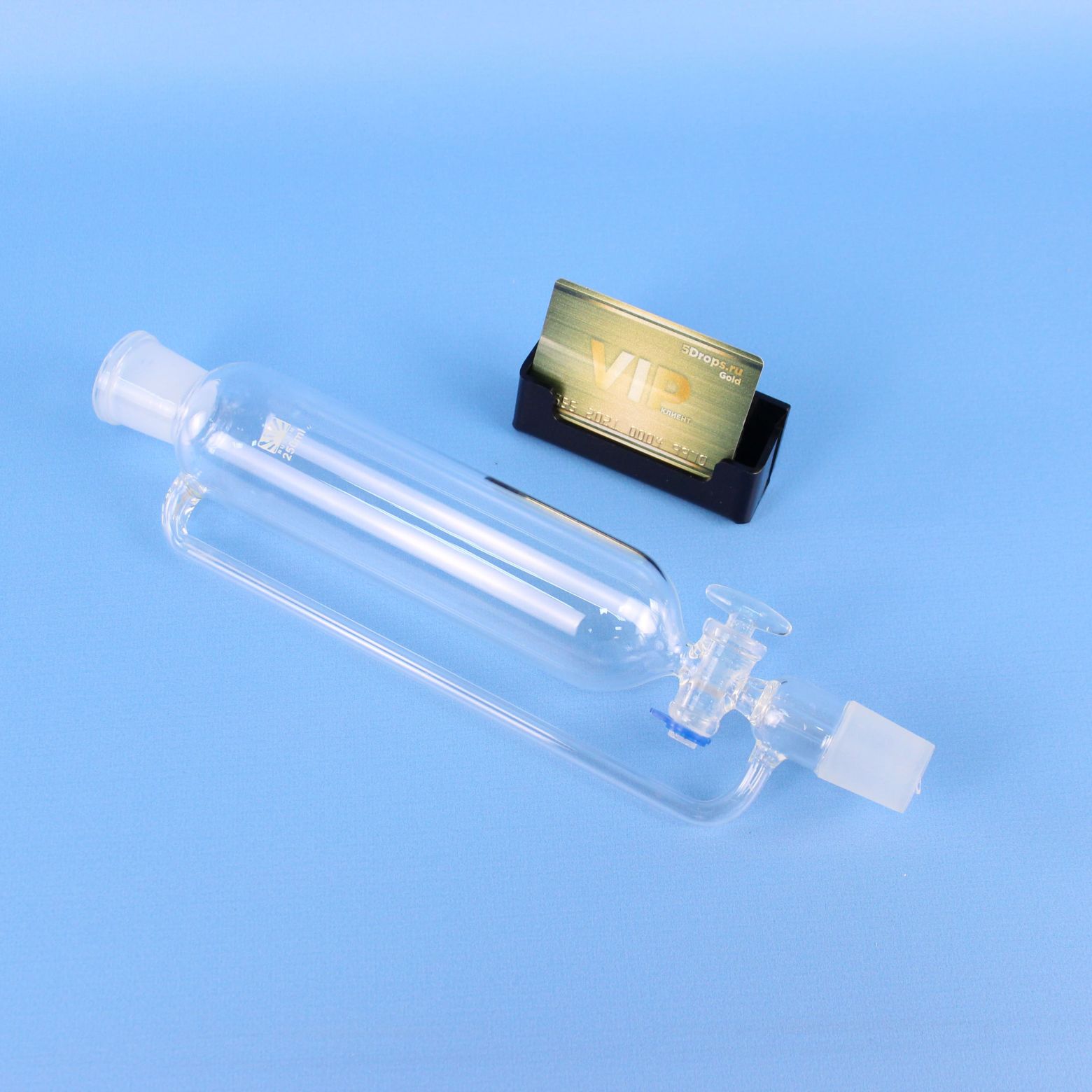 Воронка капельная цилиндрическая ВД-2-250 объемом 250 мл предназначена для точного и дозированного добавления жидких реактивов в ходе лабораторных экспериментов. Оборудована компенсатором давления, который обеспечивает равномерное поступление жидкости и предотвращает образование вакуума в системе.